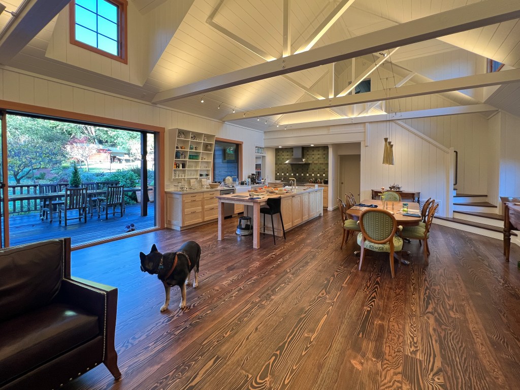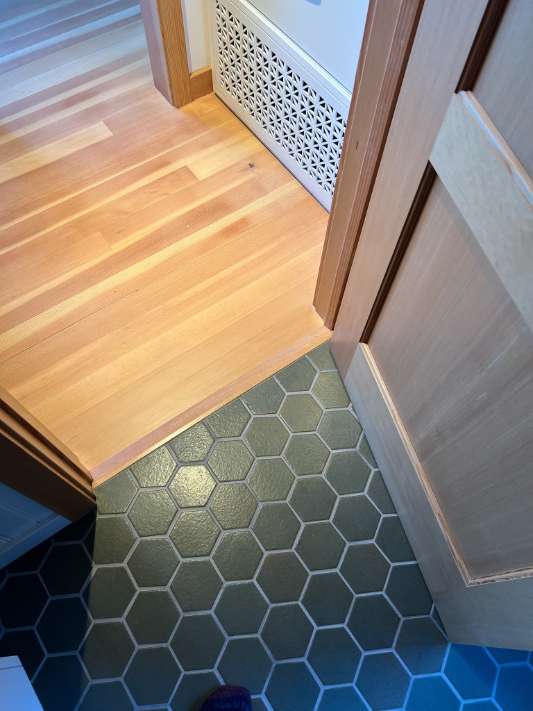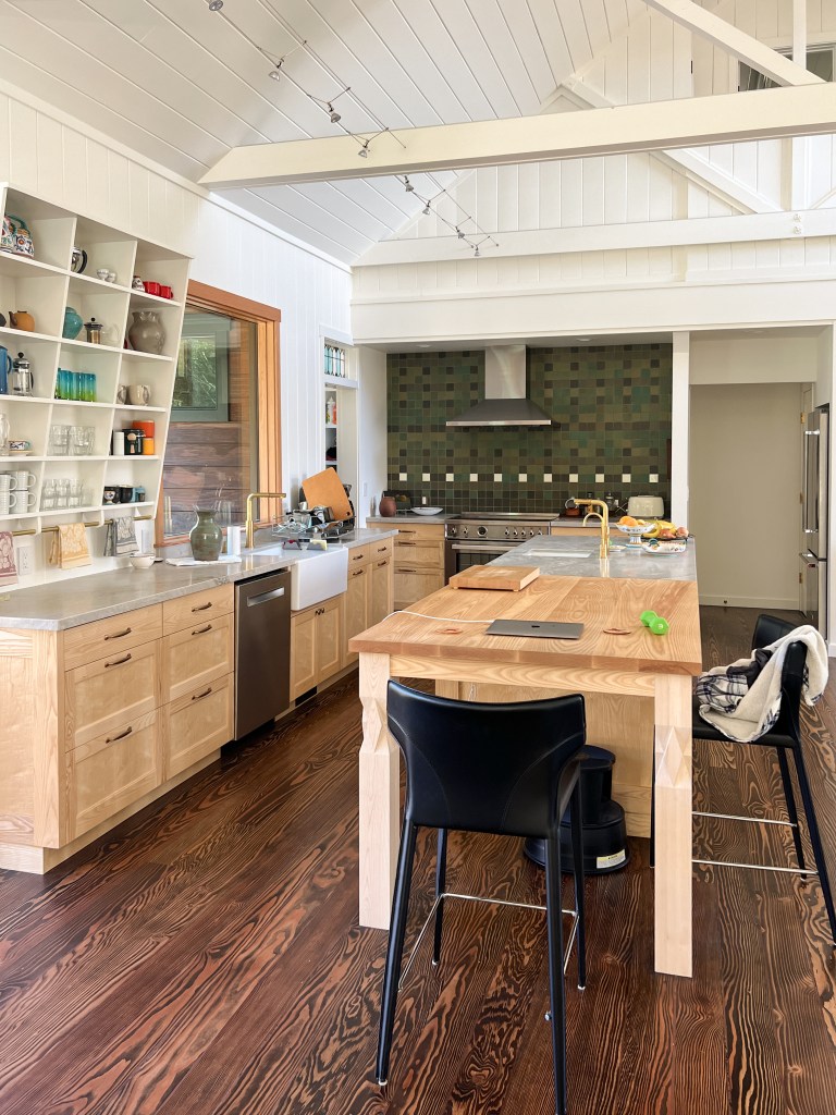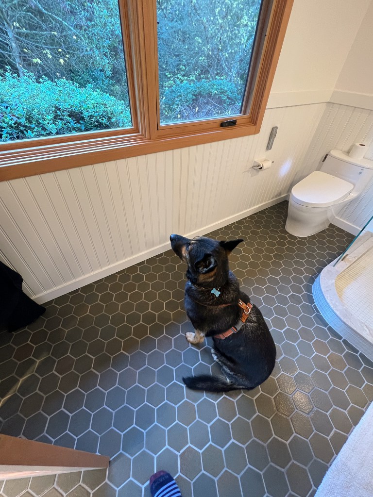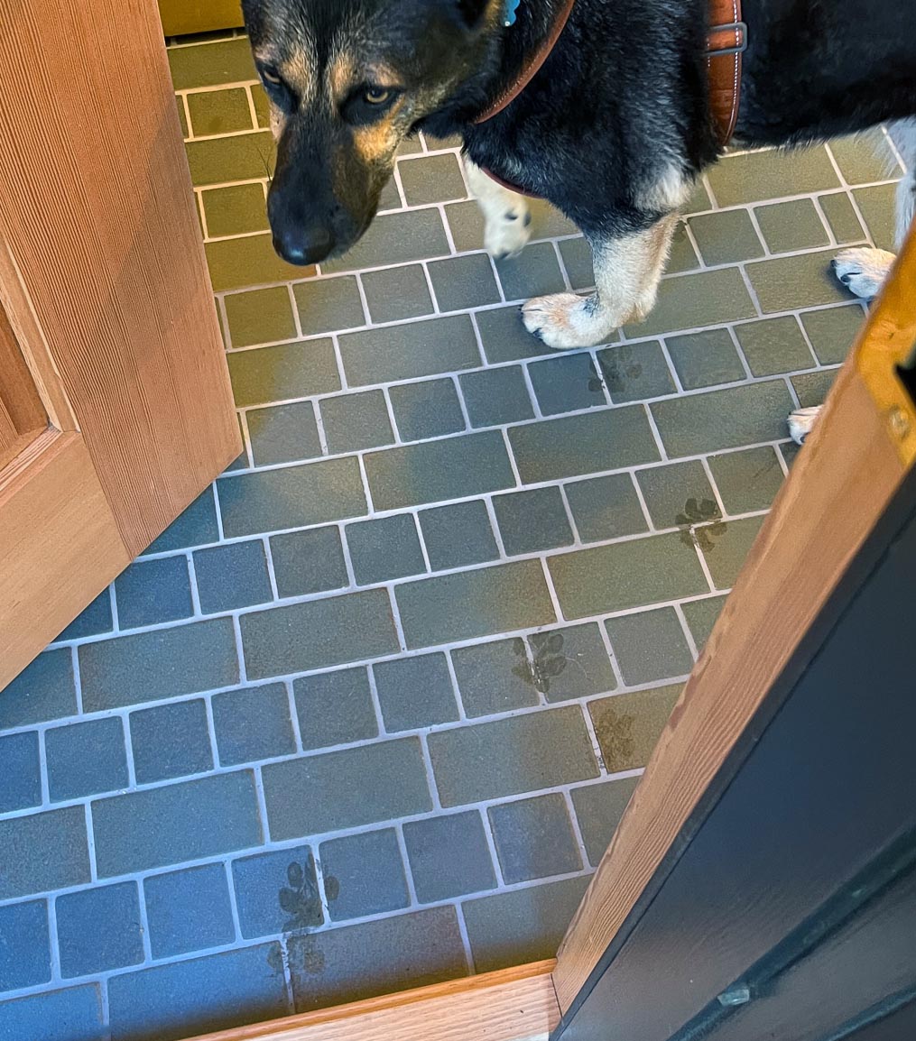 Looking down on the big room – I love the flooring – It is existing, structural tongue and groove fir subfloor, but it was lighter and kind of pickled with dark marine grade caulk/ filler between the boards. We thought of putting new flooring on top, but the boards were so nice and long, which is unusual these days. Once we put on the dark stain the super nice figured grain popped and we loved it. The indirect LED strip lighting atop the collar ties also worked out well. The electrician did a great job and knew to stop the lights a bit shy of the ends to minimize bright spots. (This photo accentuates the bright spots) Before shot of the flooring/ structural subfloor with younger Èowyn.I had a goal to be very particular about the clips for the shower glass. So often the clips are not given much thought and they ruin the simple clean look. (First I tried to talk the builder into no clips at the bottom, recessing the glass into the curb, but they were not game to try this detail. The green floor tile is Arto and the shower floor and walls is Fireclay.Èowyn likes the big window looking into the woodsI was proud of this built-in brass towel bar. (Kind of wish the electrical devices were more orderly/ aligned and in a real photo shoot Id probably not have a used towel. Oh well)High tech- low tech – this is the bidet/ heated toilet seat controller and also the handmade wood toilet paper holder with a found gnarled stick. Another custom brass towel bar – this one with ash. You can also see the cool grain in the floor and the mudroom floor tile by Arto. I thought I maybe specified too many pegs in the mudroom, but every single one was being used on the day I was there. Another picture of the green hex Arto tile transitioning to fir flooring. The decorative cold air return cover for the forced air system is in the base of the linen cabinet – painted white to match the cabinet. We had fun with the sun rays over the back door (replacing glass that just caused the mudroom to overheat) and John McBride carved us some more diamond posts for the new covered porch. (Porch is the only addition to the house) This is a photo of the architect’s dog tracking water into the clients recently finished house. Also a photo of very nice green (Elder Green by Arto..photo doesn’t do it justice) tile floor in the entry that can take a little water no problem.This is another view of the big room. Big bifold doors connect the space to the garden and orchard to the west. Ample lighting in the room is provided by indirect LEDs shining up and cable lights for task lighting over the kitchen and dining room. You can’t see all the added insulation in the roof and air sealing and new windows and doors to keep the space warm in the rainy season.Here you can see the ash diamond posts at the end of island that match the redwood ones outside and also the tiled backsplash..somewhat random but also a pattern.A view of the mudroom – pendant by Metrolighting and painted shelving, pretty mushroom Arto tile floor, splash of color in the stained glass (fabricated by Feral Studios, designed by yours truly) I’m not going to bother with the not so nice before shot, but I was very happy with the lighting in this room after construction – Three of these large pendants from Metro Lighting in Berkeley.