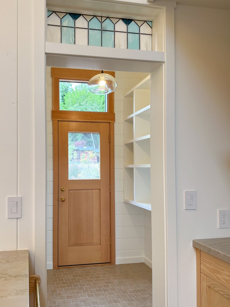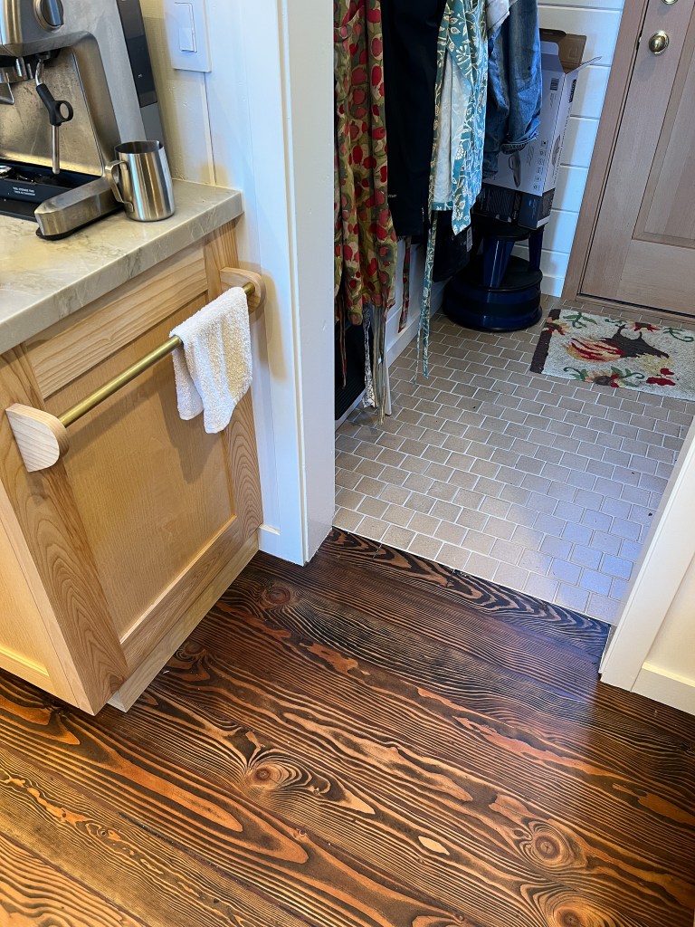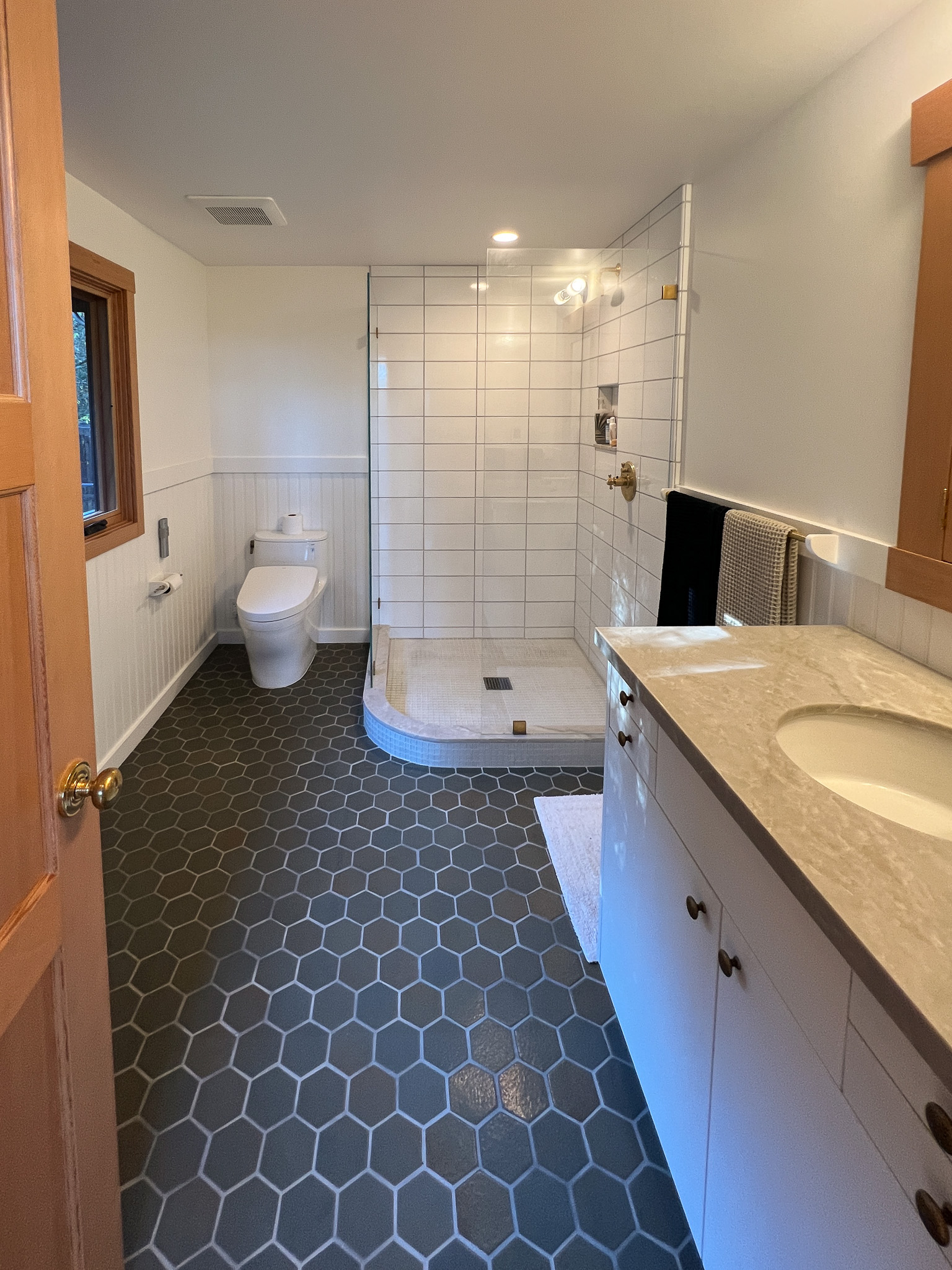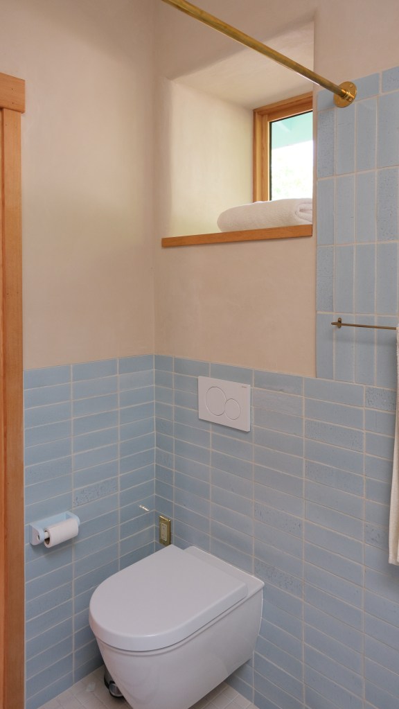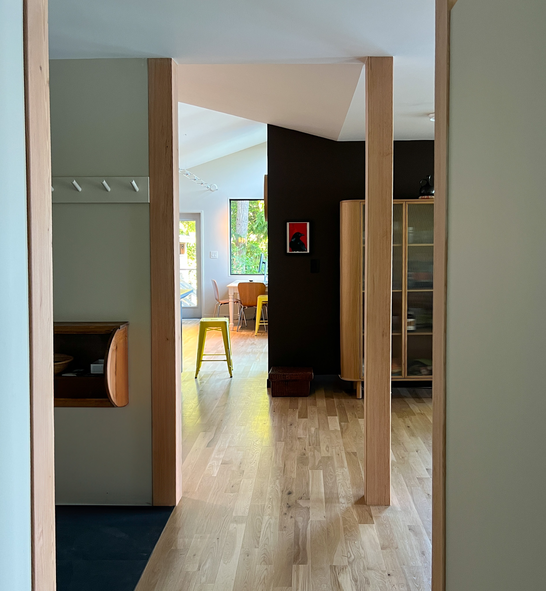 Looking down on the big room – I love the flooring – It is existing, structural tongue and groove fir subfloor, but it was lighter and kind of pickled with dark marine grade caulk/ filler between the boards. We thought of putting new flooring on top, but the boards were so nice and long, which is unusual these days. Once we put on the dark stain the super nice figured grain popped and we loved it. The indirect LED strip lighting atop the collar ties also worked out well. The electrician did a great job and knew to stop the lights a bit shy of the ends to minimize bright spots. (This photo accentuates the bright spots) Before shot of the flooring/ structural subfloor with younger Èowyn.I had a goal to be very particular about the clips for the shower glass. So often the clips are not given much thought and they ruin the simple clean look. (First I tried to talk the builder into no clips at the bottom, recessing the glass into the curb, but they were not game to try this detail. The green floor tile is Arto and the shower floor and walls is Fireclay.Èowyn likes the big window looking into the woodsI was proud of this built-in brass towel bar. (Kind of wish the electrical devices were more orderly/ aligned and in a real photo shoot Id probably not have a used towel. Oh well)High tech- low tech – this is the bidet/ heated toilet seat controller and also the handmade wood toilet paper holder with a found gnarled stick. Another custom brass towel bar – this one with ash. You can also see the cool grain in the floor and the mudroom floor tile by Arto. I thought I maybe specified too many pegs in the mudroom, but every single one was being used on the day I was there. Another picture of the green hex Arto tile transitioning to fir flooring. The decorative cold air return cover for the forced air system is in the base of the linen cabinet – painted white to match the cabinet. We had fun with the sun rays over the back door (replacing glass that just caused the mudroom to overheat) and John McBride carved us some more diamond posts for the new covered porch. (Porch is the only addition to the house) This is a photo of the architect’s dog tracking water into the clients recently finished house. Also a photo of very nice green (Elder Green by Arto..photo doesn’t do it justice) tile floor in the entry that can take a little water no problem.This is another view of the big room. Big bifold doors connect the space to the garden and orchard to the west. Ample lighting in the room is provided by indirect LEDs shining up and cable lights for task lighting over the kitchen and dining room. You can’t see all the added insulation in the roof and air sealing and new windows and doors to keep the space warm in the rainy season.Here you can see the ash diamond posts at the end of island that match the redwood ones outside and also the tiled backsplash..somewhat random but also a pattern.A view of the mudroom – pendant by Metrolighting and painted shelving, pretty mushroom Arto tile floor, splash of color in the stained glass (fabricated by Feral Studios, designed by yours truly) I’m not going to bother with the not so nice before shot, but I was very happy with the lighting in this room after construction – Three of these large pendants from Metro Lighting in Berkeley.