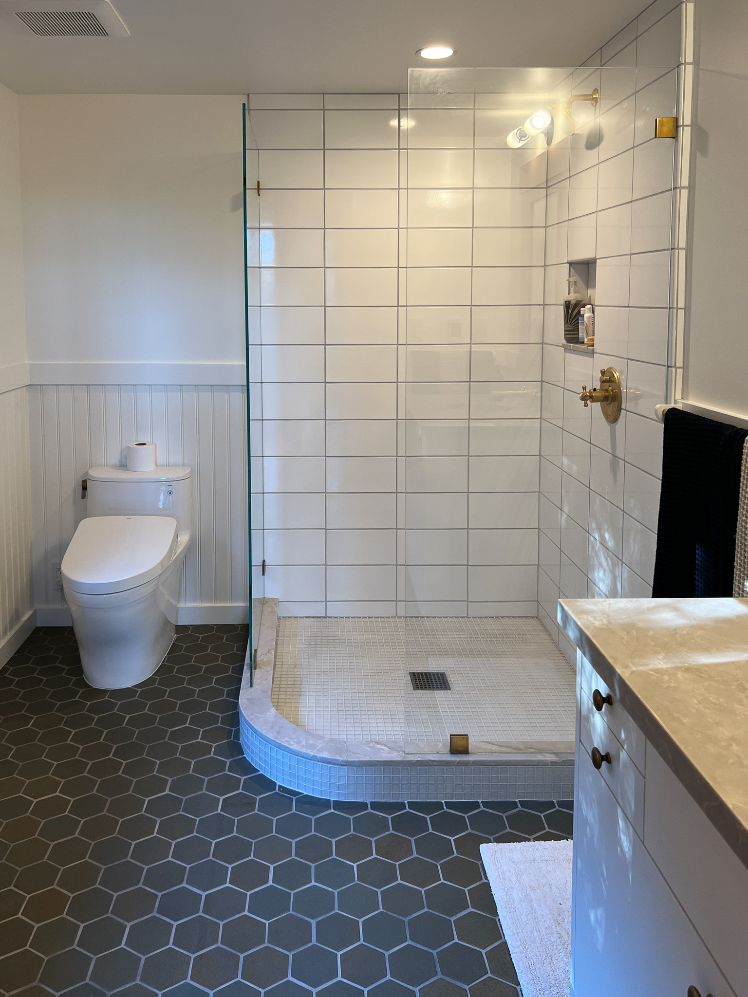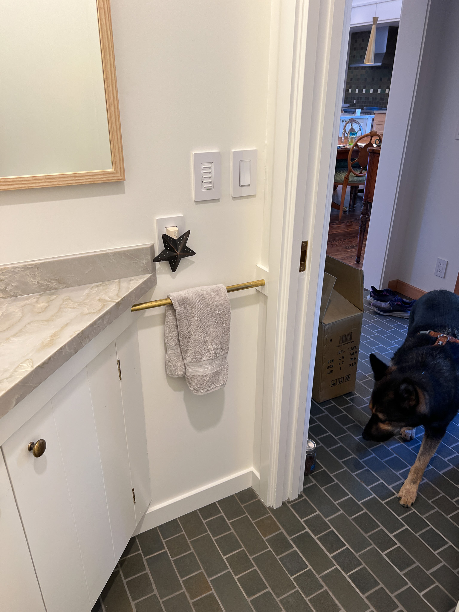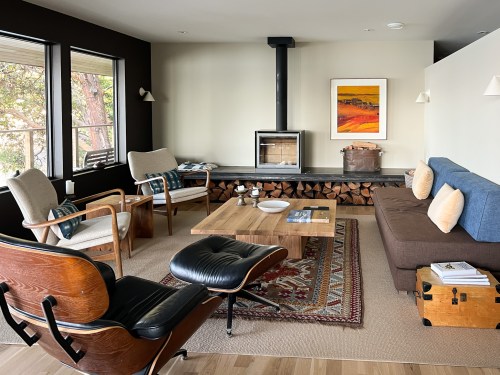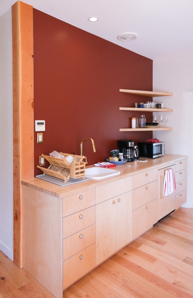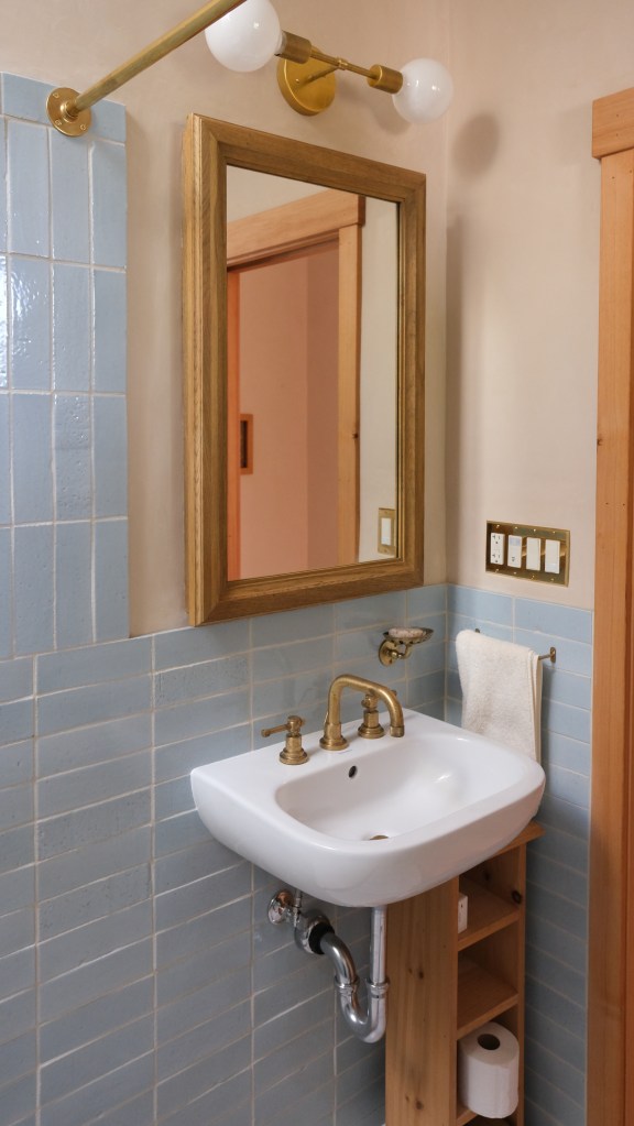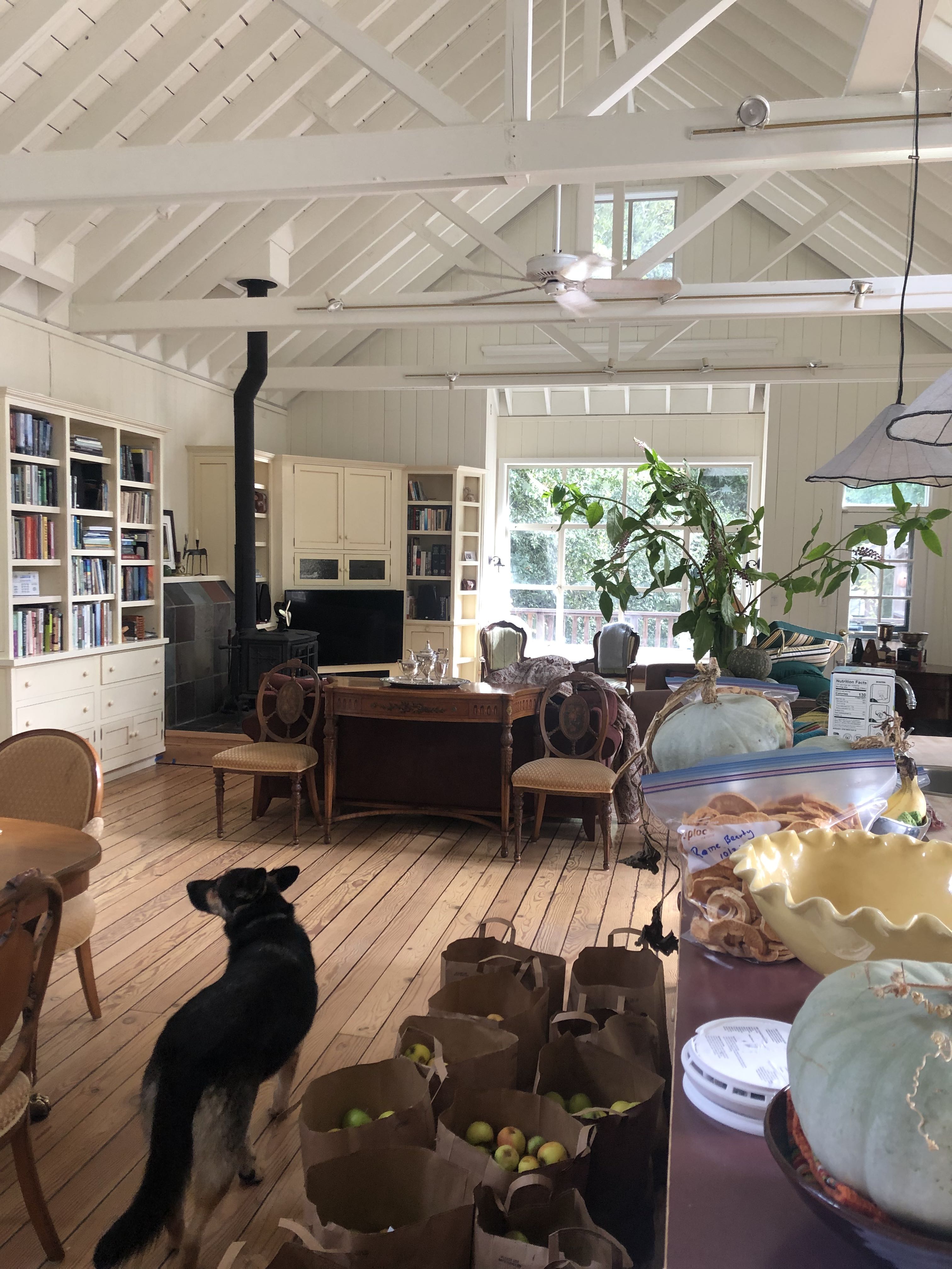 Looking down on the big room – I love the flooring – It is existing, structural tongue and groove fir subfloor, but it was lighter and kind of pickled with dark marine grade caulk/ filler between the boards. We thought of putting new flooring on top, but the boards were so nice and long, which is unusual these days. Once we put on the dark stain the super nice figured grain popped and we loved it. The indirect LED strip lighting atop the collar ties also worked out well. The electrician did a great job and knew to stop the lights a bit shy of the ends to minimize bright spots. (This photo accentuates the bright spots) Before shot of the flooring/ structural subfloor with younger Èowyn.I had a goal to be very particular about the clips for the shower glass. So often the clips are not given much thought and they ruin the simple clean look. (First I tried to talk the builder into no clips at the bottom, recessing the glass into the curb, but they were not game to try this detail. The green floor tile is Arto and the shower floor and walls is Fireclay.Èowyn likes the big window looking into the woodsI was proud of this built-in brass towel bar. (Kind of wish the electrical devices were more orderly/ aligned and in a real photo shoot Id probably not have a used towel. Oh well)High tech- low tech – this is the bidet/ heated toilet seat controller and also the handmade wood toilet paper holder with a found gnarled stick. Another custom brass towel bar – this one with ash. You can also see the cool grain in the floor and the mudroom floor tile by Arto. I thought I maybe specified too many pegs in the mudroom, but every single one was being used on the day I was there. Another picture of the green hex Arto tile transitioning to fir flooring. The decorative cold air return cover for the forced air system is in the base of the linen cabinet – painted white to match the cabinet. We had fun with the sun rays over the back door (replacing glass that just caused the mudroom to overheat) and John McBride carved us some more diamond posts for the new covered porch. (Porch is the only addition to the house) This is a photo of the architect’s dog tracking water into the clients recently finished house. Also a photo of very nice green (Elder Green by Arto..photo doesn’t do it justice) tile floor in the entry that can take a little water no problem.This is another view of the big room. Big bifold doors connect the space to the garden and orchard to the west. Ample lighting in the room is provided by indirect LEDs shining up and cable lights for task lighting over the kitchen and dining room. You can’t see all the added insulation in the roof and air sealing and new windows and doors to keep the space warm in the rainy season.Here you can see the ash diamond posts at the end of island that match the redwood ones outside and also the tiled backsplash..somewhat random but also a pattern.A view of the mudroom – pendant by Metrolighting and painted shelving, pretty mushroom Arto tile floor, splash of color in the stained glass (fabricated by Feral Studios, designed by yours truly) I’m not going to bother with the not so nice before shot, but I was very happy with the lighting in this room after construction – Three of these large pendants from Metro Lighting in Berkeley.