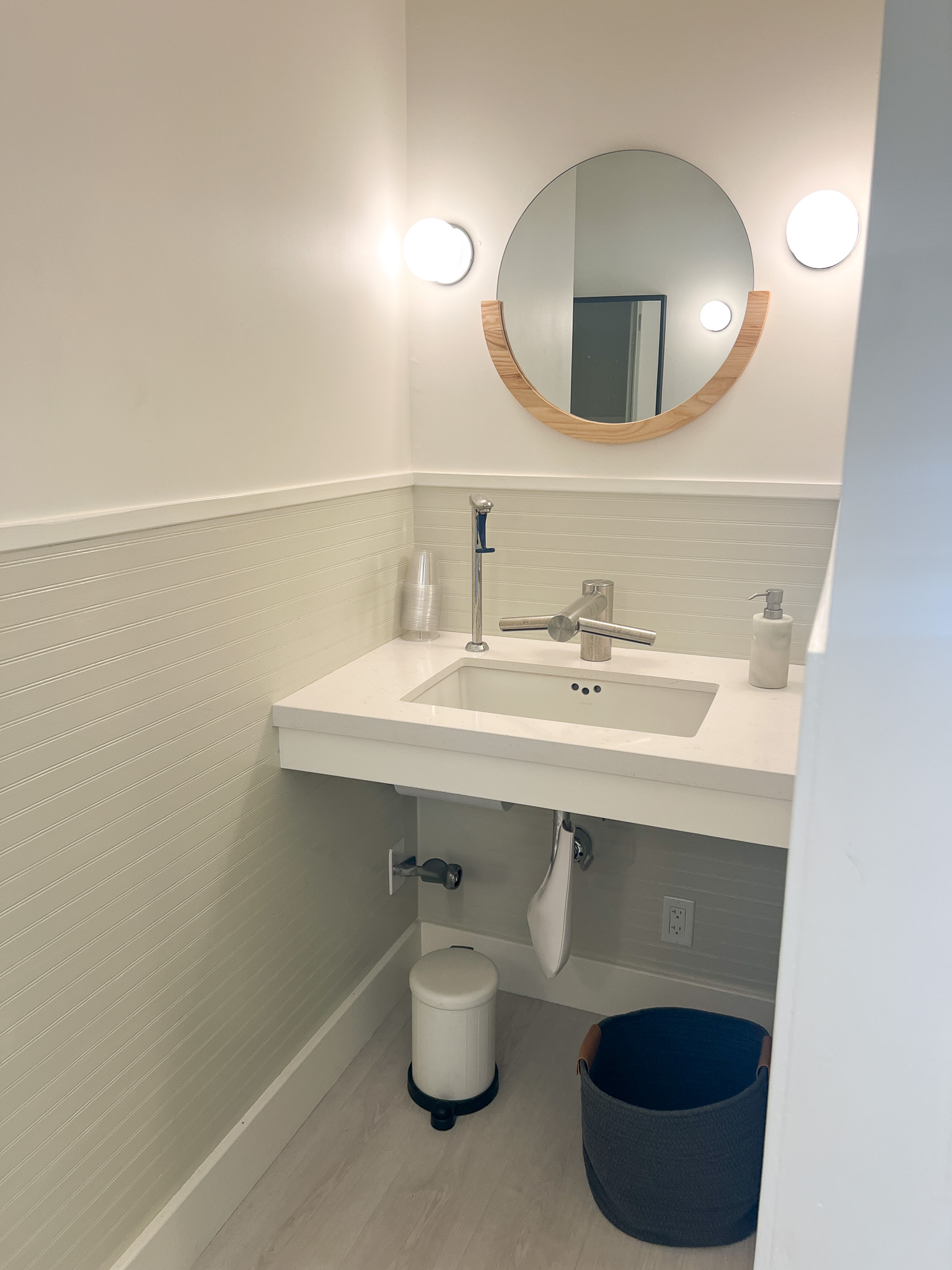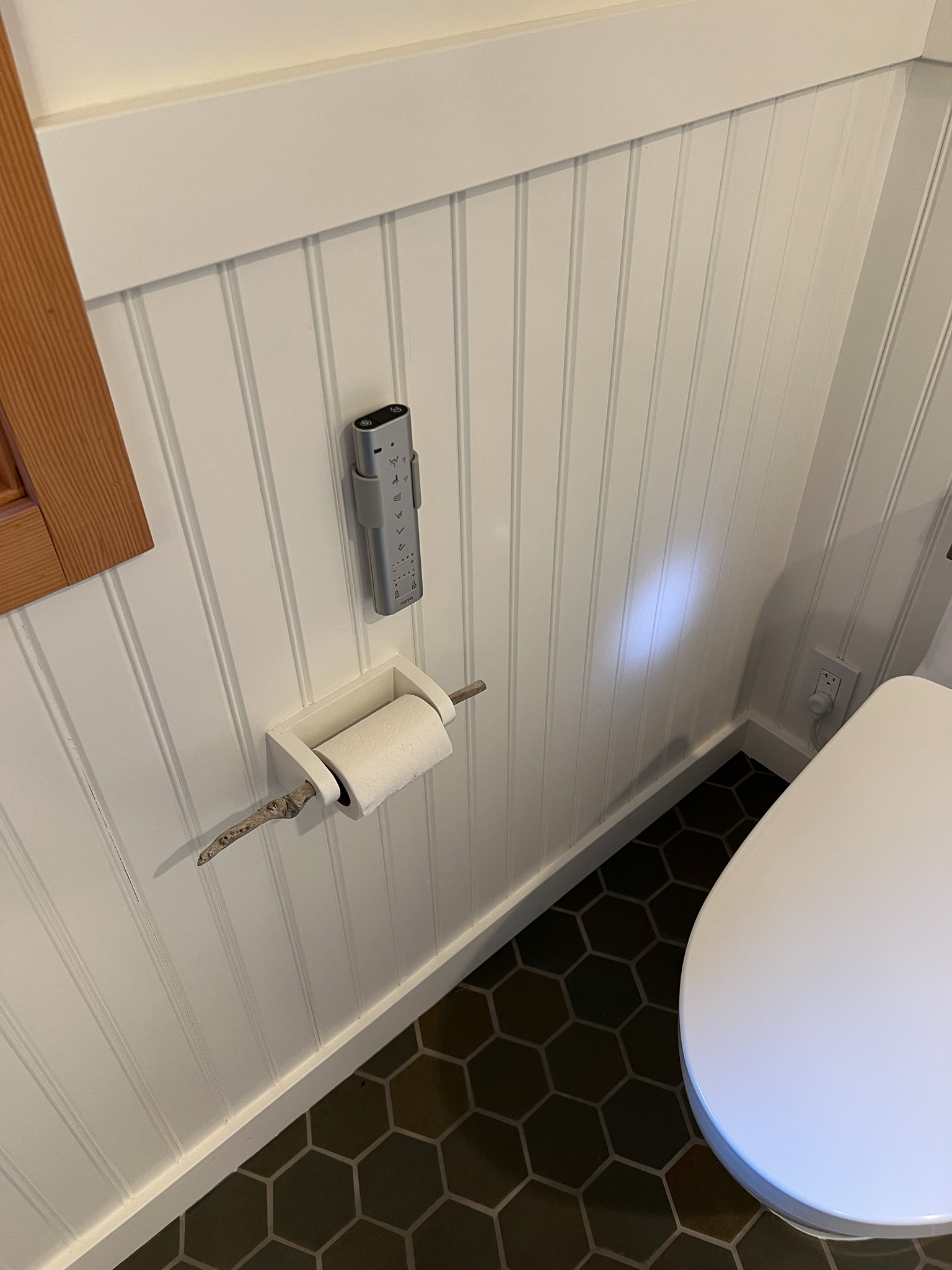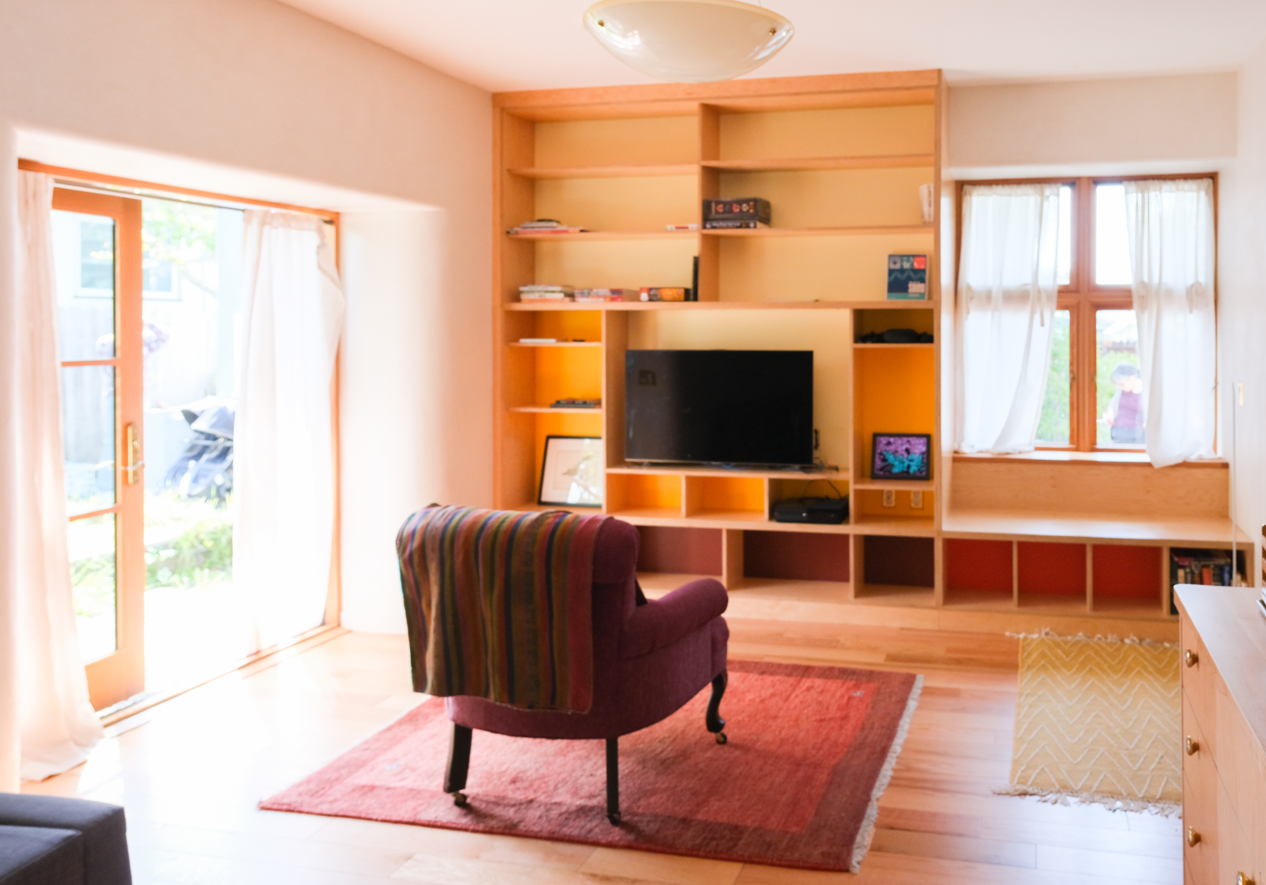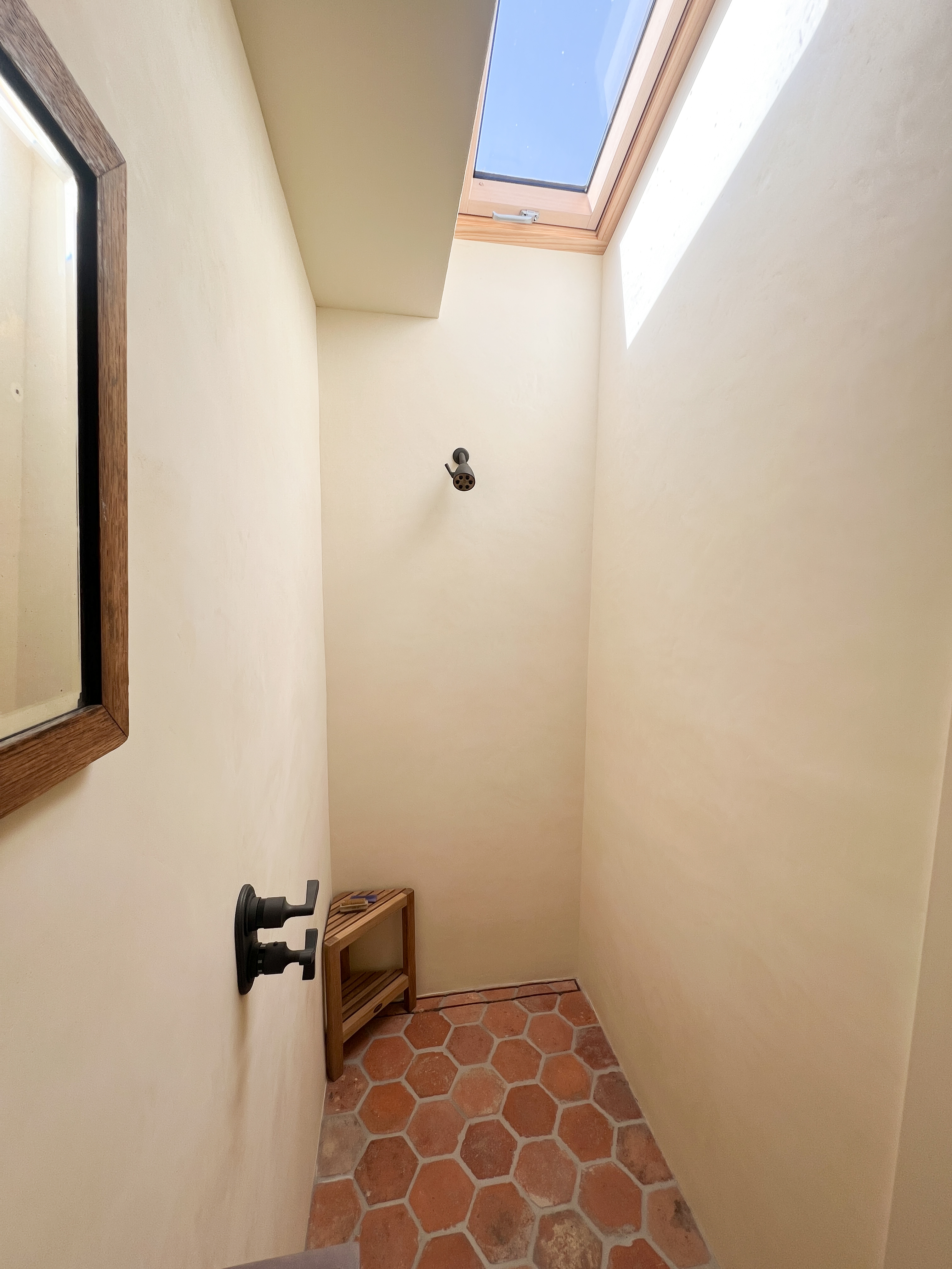 Looking down on the big room – I love the flooring – It is existing, structural tongue and groove fir subfloor, but it was lighter and kind of pickled with dark marine grade caulk/ filler between the boards. We thought of putting new flooring on top, but the boards were so nice and long, which is unusual these days. Once we put on the dark stain the super nice figured grain popped and we loved it. The indirect LED strip lighting atop the collar ties also worked out well. The electrician did a great job and knew to stop the lights a bit shy of the ends to minimize bright spots. (This photo accentuates the bright spots) Before shot of the flooring/ structural subfloor with younger Èowyn.I had a goal to be very particular about the clips for the shower glass. So often the clips are not given much thought and they ruin the simple clean look. (First I tried to talk the builder into no clips at the bottom, recessing the glass into the curb, but they were not game to try this detail. The green floor tile is Arto and the shower floor and walls is Fireclay.Èowyn likes the big window looking into the woodsI was proud of this built-in brass towel bar. (Kind of wish the electrical devices were more orderly/ aligned and in a real photo shoot Id probably not have a used towel. Oh well)High tech- low tech – this is the bidet/ heated toilet seat controller and also the handmade wood toilet paper holder with a found gnarled stick. Another custom brass towel bar – this one with ash. You can also see the cool grain in the floor and the mudroom floor tile by Arto. I thought I maybe specified too many pegs in the mudroom, but every single one was being used on the day I was there. Another picture of the green hex Arto tile transitioning to fir flooring. The decorative cold air return cover for the forced air system is in the base of the linen cabinet – painted white to match the cabinet. We had fun with the sun rays over the back door (replacing glass that just caused the mudroom to overheat) and John McBride carved us some more diamond posts for the new covered porch. (Porch is the only addition to the house) This is a photo of the architect’s dog tracking water into the clients recently finished house. Also a photo of very nice green (Elder Green by Arto..photo doesn’t do it justice) tile floor in the entry that can take a little water no problem.This is another view of the big room. Big bifold doors connect the space to the garden and orchard to the west. Ample lighting in the room is provided by indirect LEDs shining up and cable lights for task lighting over the kitchen and dining room. You can’t see all the added insulation in the roof and air sealing and new windows and doors to keep the space warm in the rainy season.Here you can see the ash diamond posts at the end of island that match the redwood ones outside and also the tiled backsplash..somewhat random but also a pattern.A view of the mudroom – pendant by Metrolighting and painted shelving, pretty mushroom Arto tile floor, splash of color in the stained glass (fabricated by Feral Studios, designed by yours truly) I’m not going to bother with the not so nice before shot, but I was very happy with the lighting in this room after construction – Three of these large pendants from Metro Lighting in Berkeley.