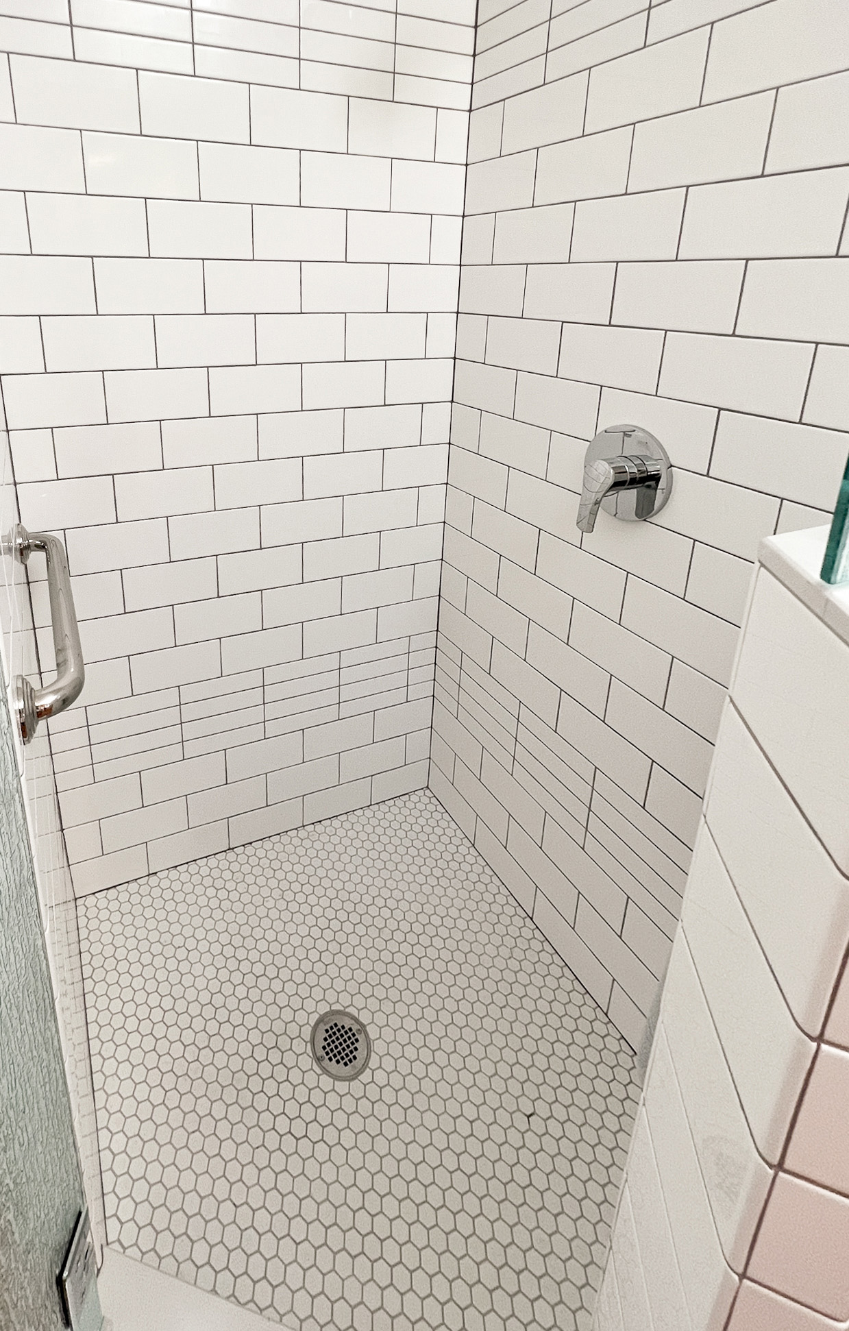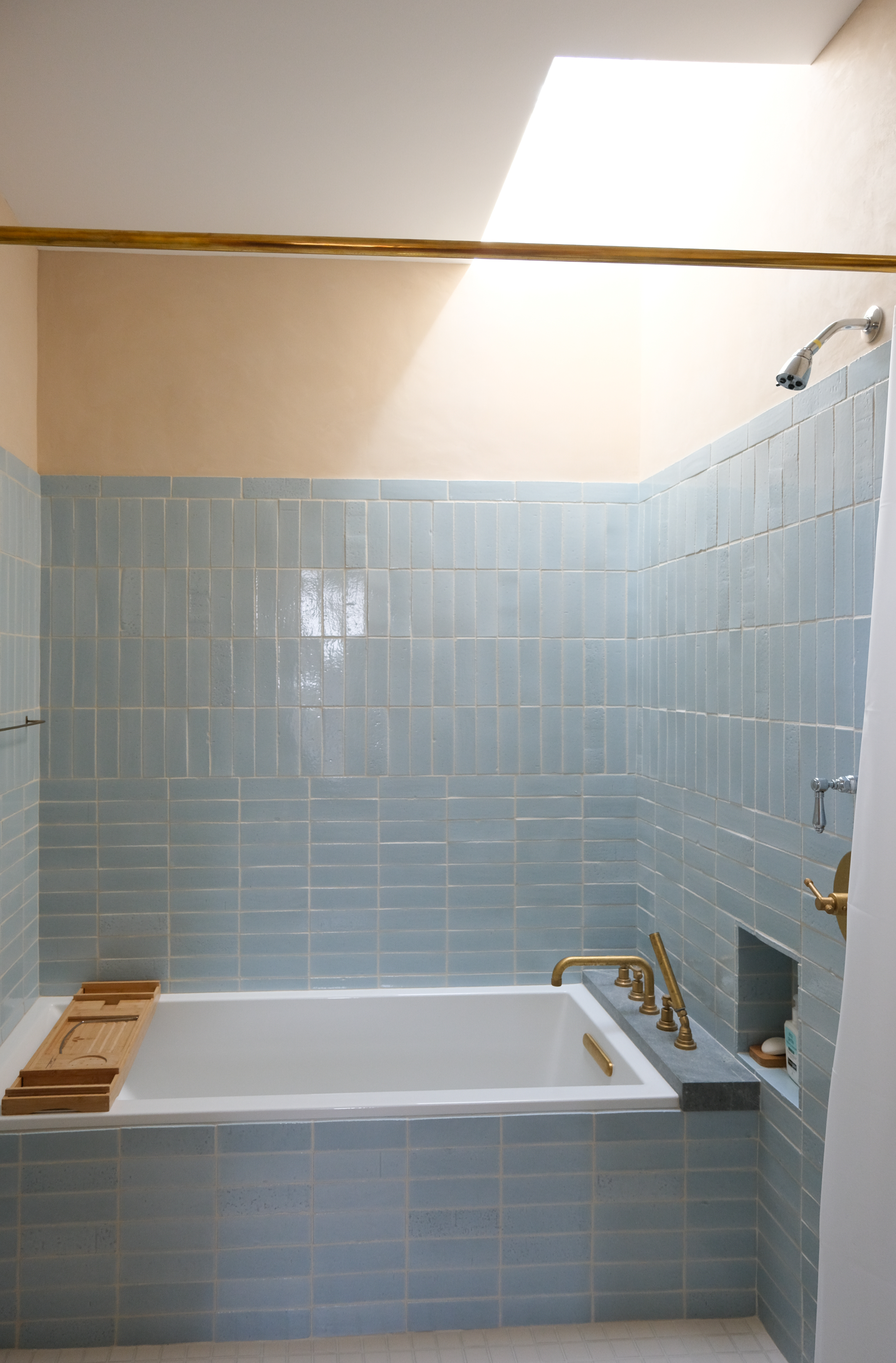 I enjoyed adding a bit more pattern to simple white tiled tub and shower walls. This was a recent tiny house bathroom in North Berkeley. Work was accomplished by Steve Coleman Builders and Sarah Young Tile.