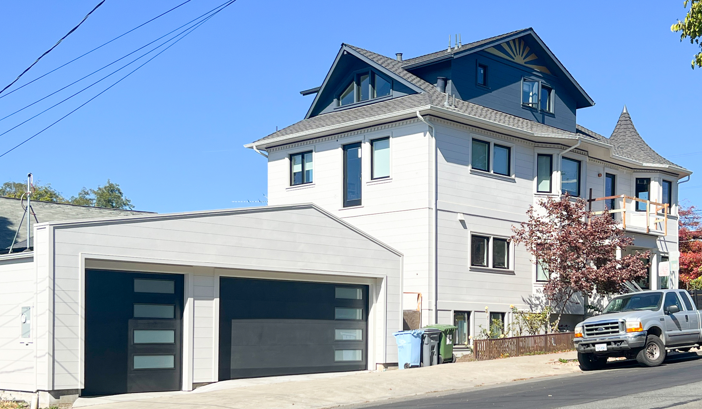 These guys are still waiting on some steel railings & southside deck & stairs, but you can see the basic transformation. We added some rooms on top and were sad to loose the distinctive little attic dormer. (See before shot below) I think we added just as much whimsical character back with the new details up top. Some serious energy upgrades and top to bottom remodel also occurred along the way.