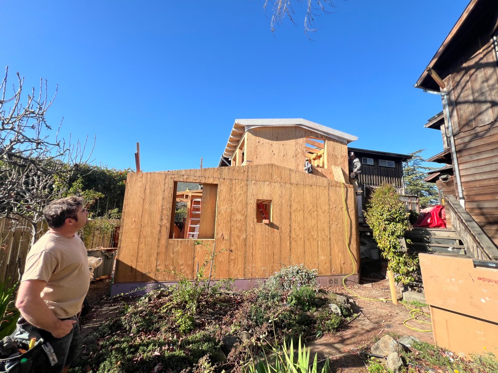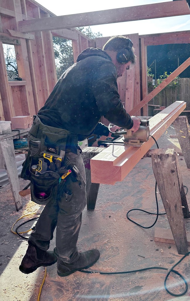 The owner took these photos for me of our little ADU taking shape. In the first photo you can see our 4×6 rafter tails with a curve. These will get gyp sheathing above with non flammable (Hardiboard & Boral) material on the outside. No venting. (Roof sheathing is kept above the dewpoint with rigid insulation on top.) The lower eaves that are less visible will be enclosed completely. The last photo is john rabbeting one of the exposed fir beams for the interior.