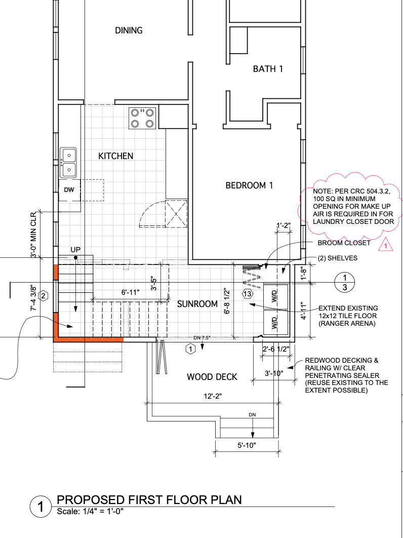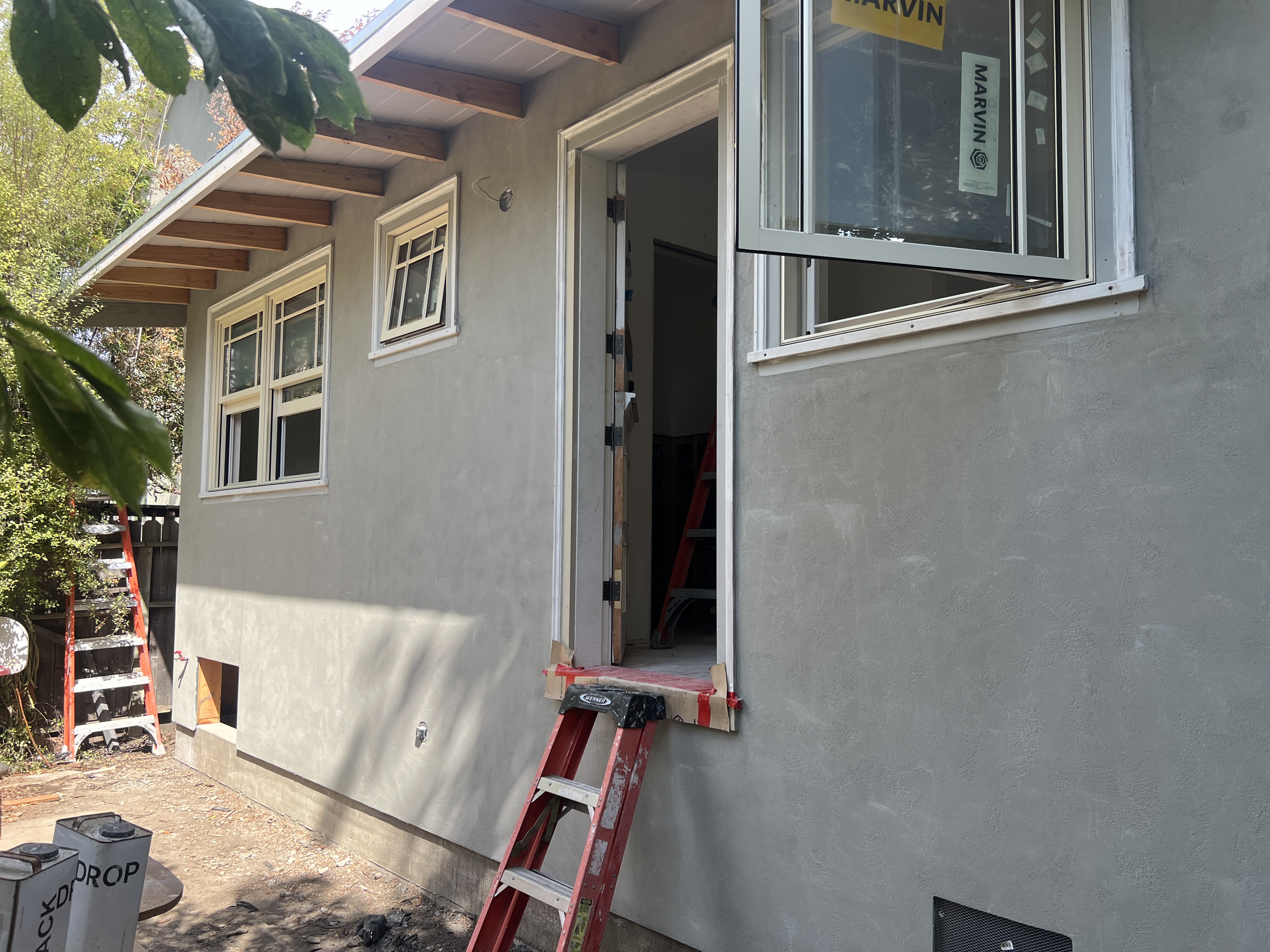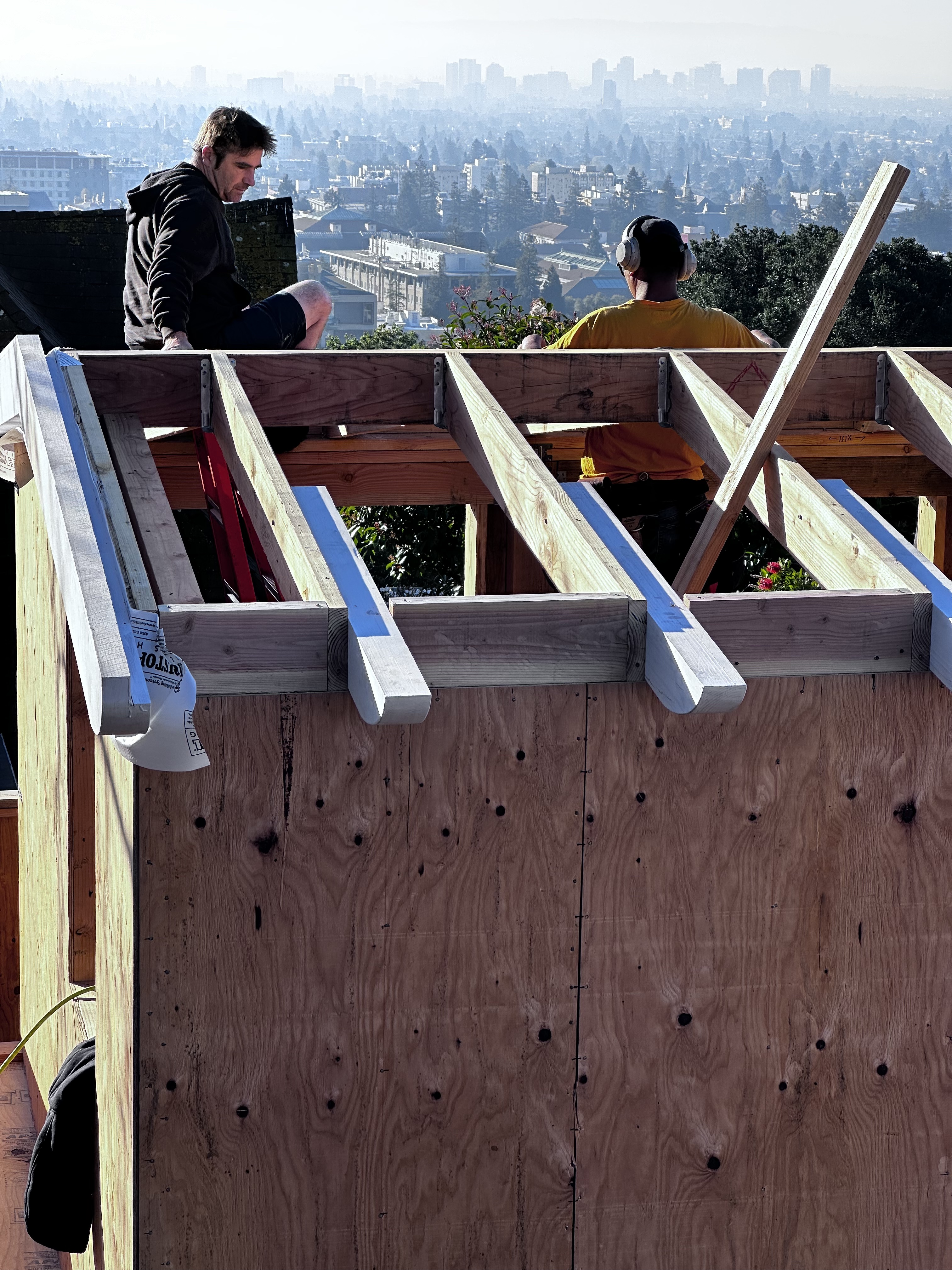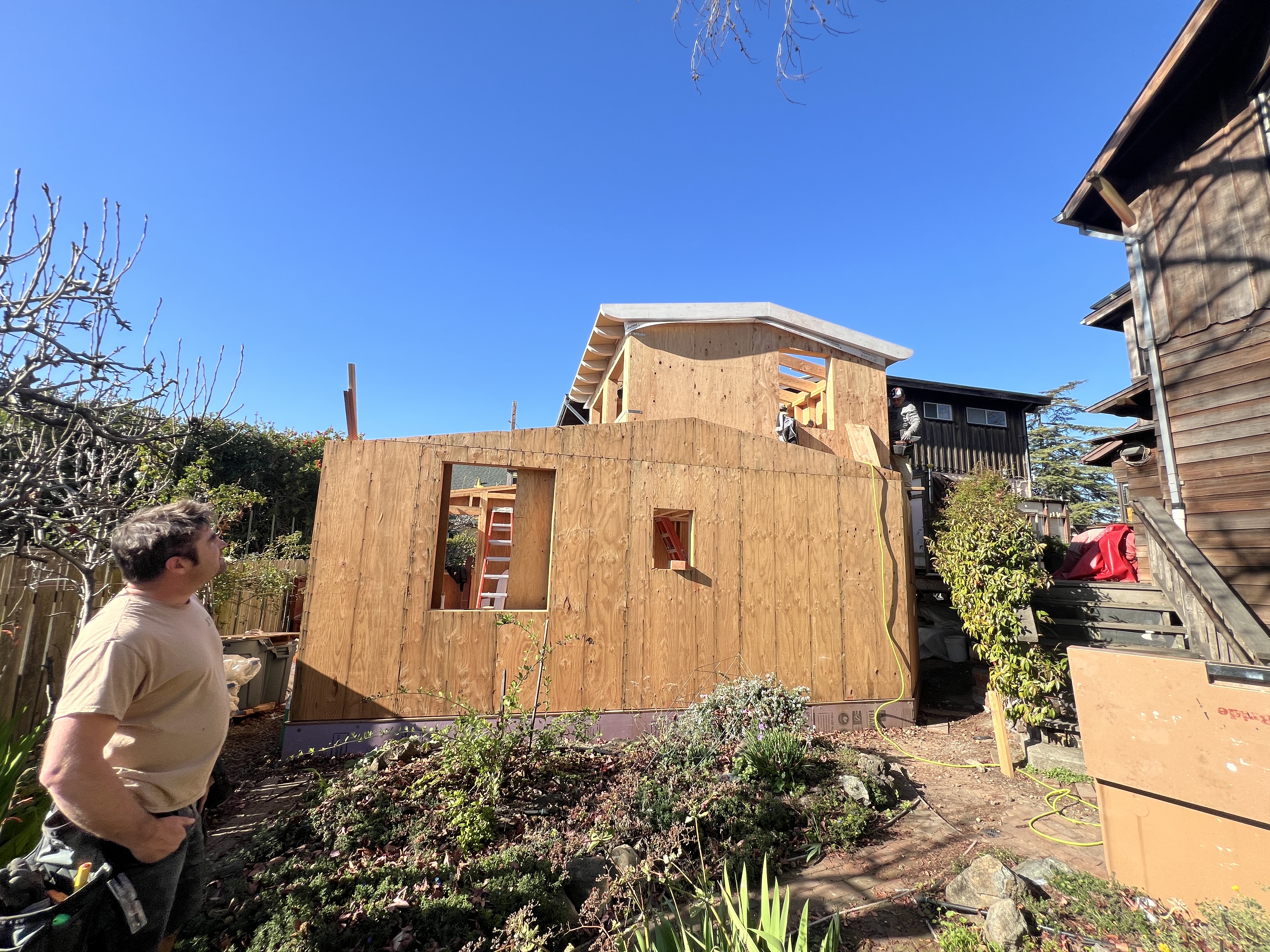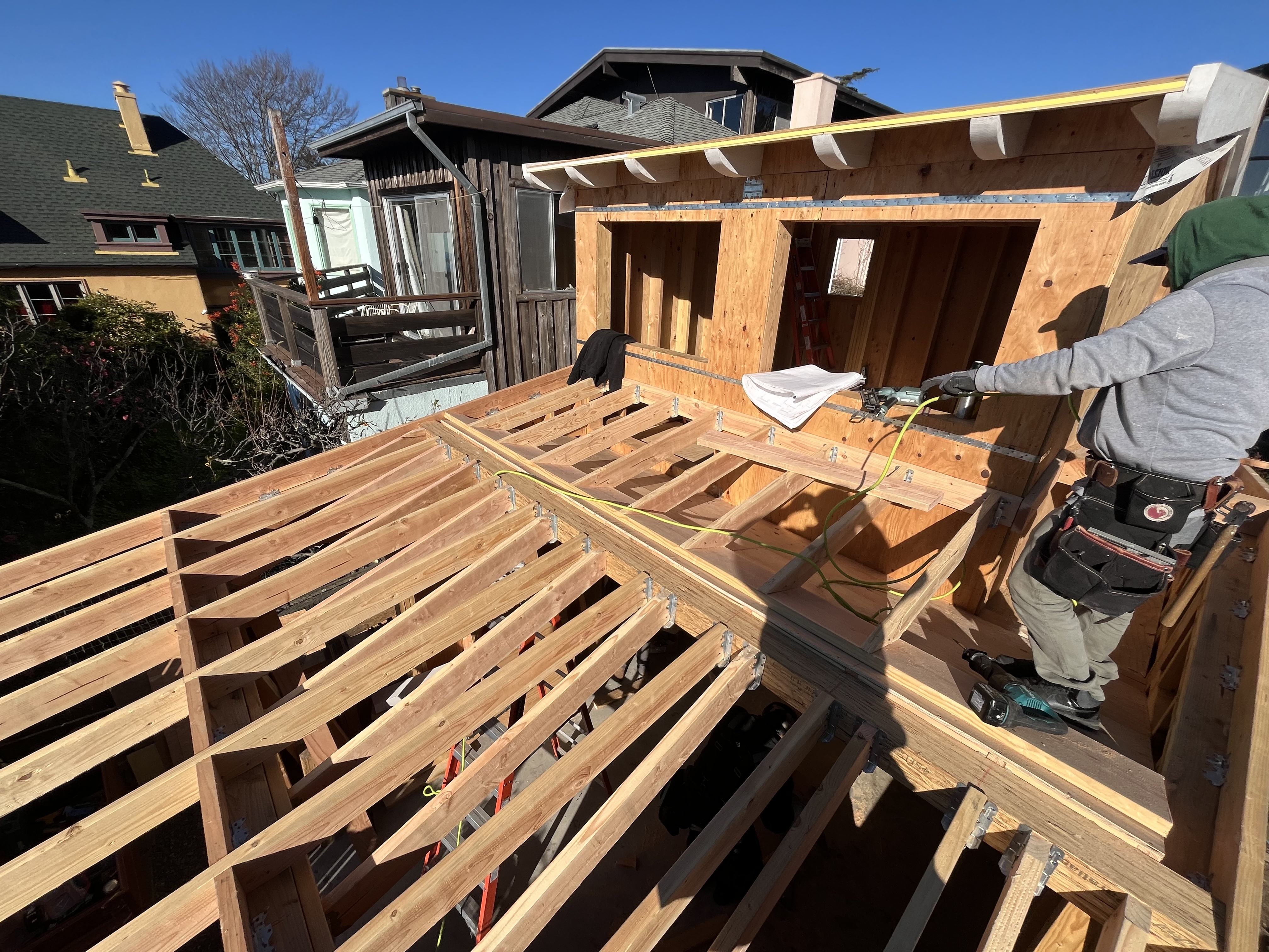 Framing Underway (Oscar of McBride Construction hard at work) A small addition at the back of a small Berkeley house (we moved the storage, laundry and water heater to the middle and put the kitchen, dining nook, half bath, and reading nook at the back of the house by the yard. I like the deep eave over the door and windows and the pretty fir rafter tails We added a skylight in the middle of the house…a lot of bang for the skylight buck. To right of skylight is laundry, pantry, and mechanical space and to the left is the kitchen and then the back yard.