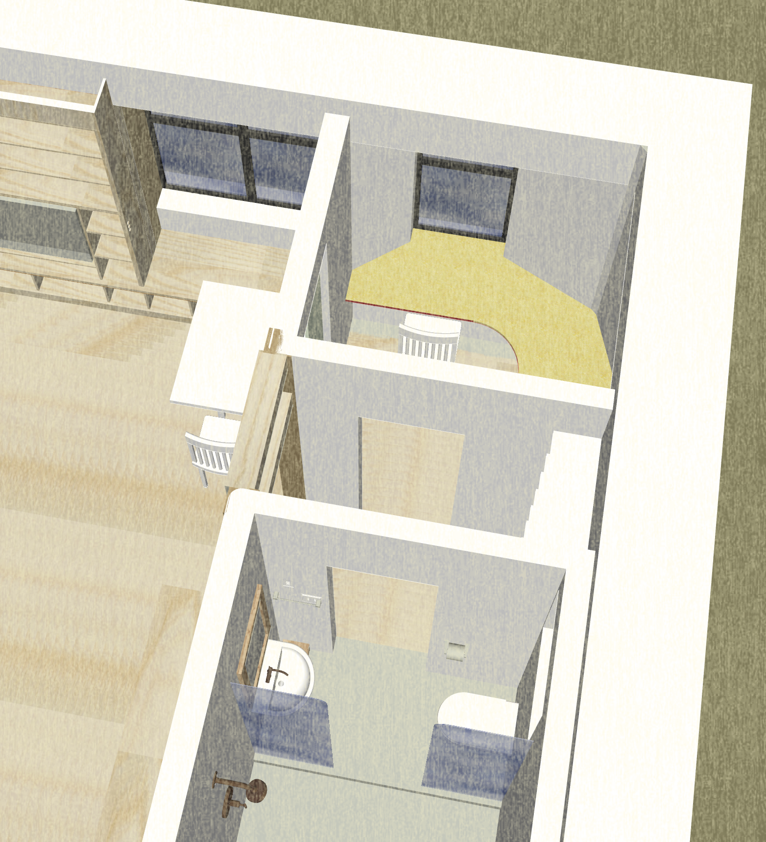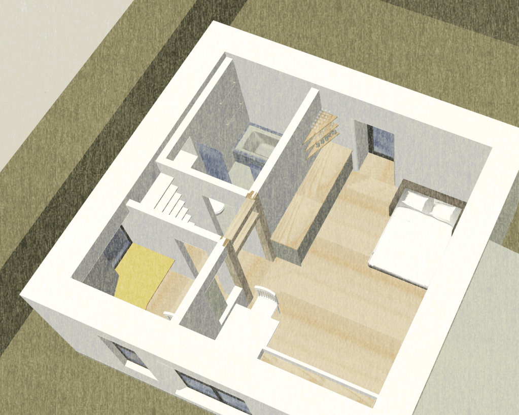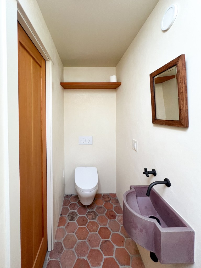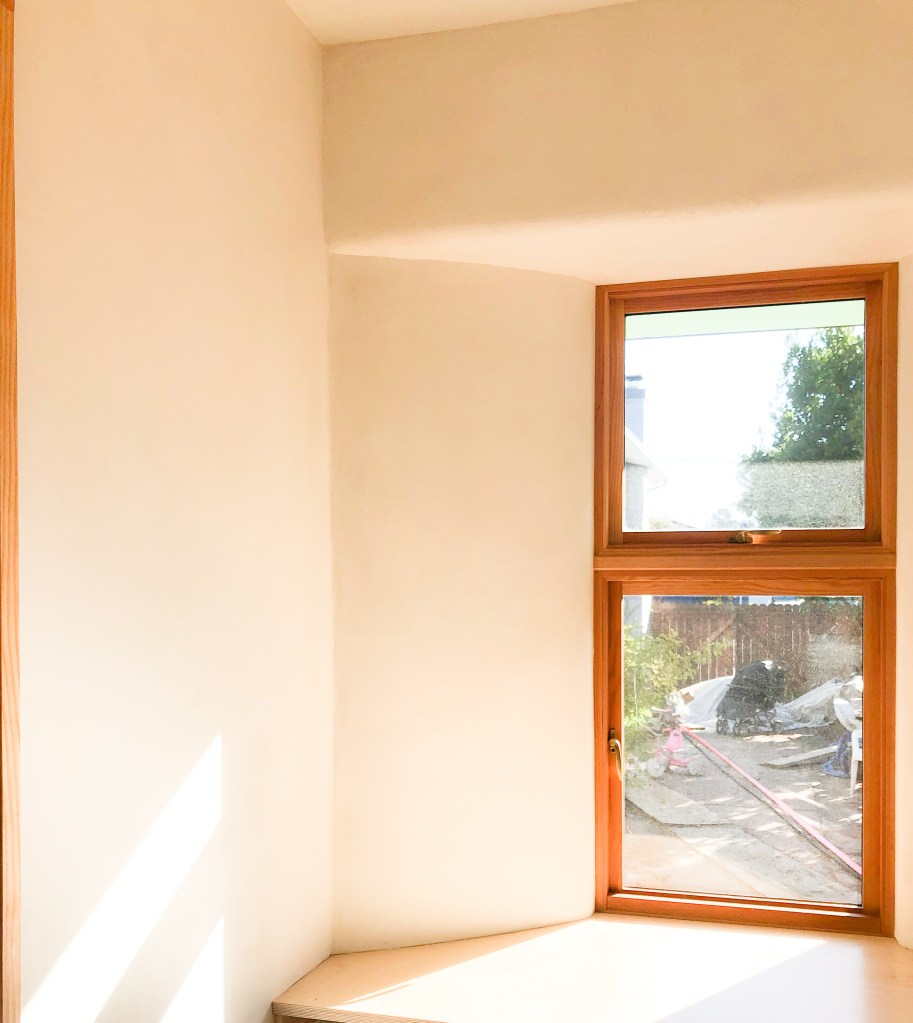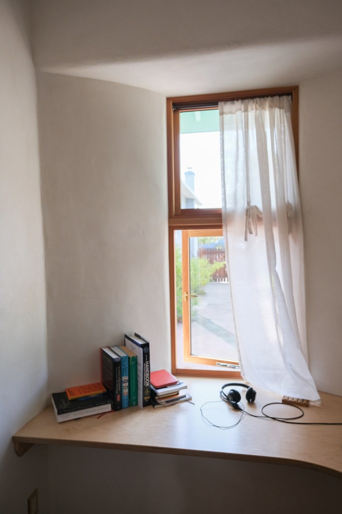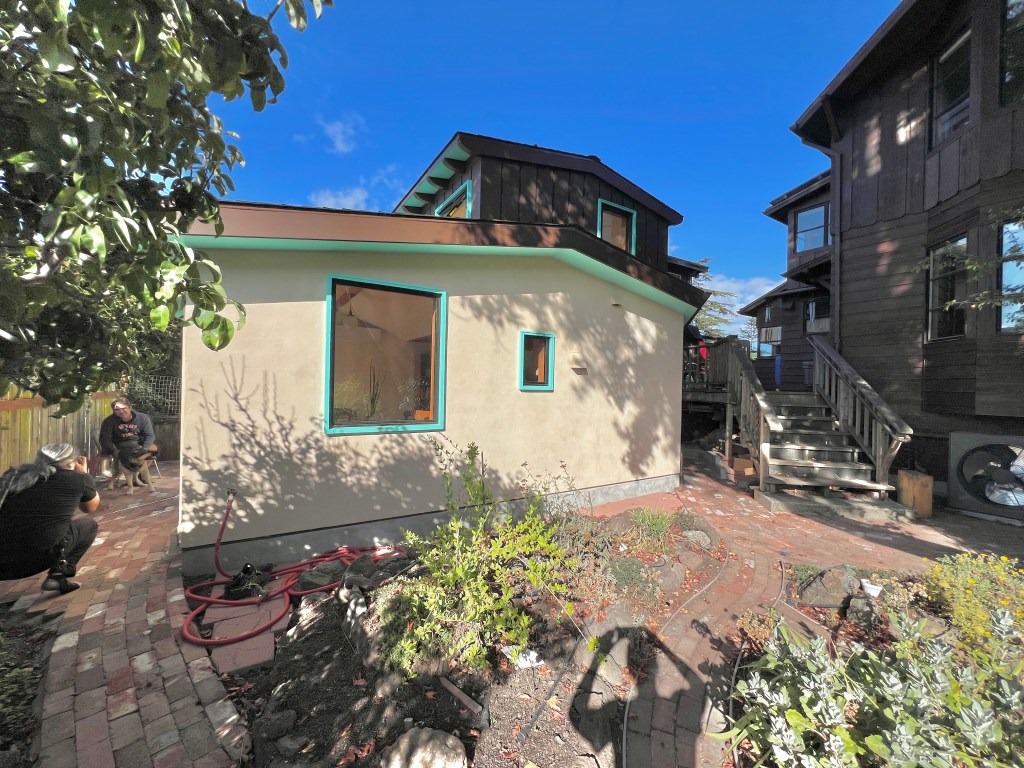 This photo shows the builder, John McBride & the construction of the curved walls at the doorsA fun, colorful cabinet for books and entertainment system and the deep window seat to the right (needs it cushion still) You can see the finished curves at the doorway to left. office window and desk built into the thick wallsWindows on the south side with concrete sills, golden lime plaster, and bright painted soffits I (& some AI ) added the garden in the foreground because this photo was taken before landscaping.)no AI on the garden here 🙂 deep bathroom windowTilework (Fireclay) and skylight (some temp plumbing that doesn’t match 🙂 for the observant. Plaster in the bathroom is clay plaster because of its humidity control and air cleaning properties. Kitchenette – If I was an interior decorator I’d add a piece of art and declutter the counter a bit and Martha Stewart the corner shelves, but this is just a snap shot) Now, in Berkeley, a bigger refrigerator is required. This is a screenshot from the concept model showing the windowseat and office, storage hallway, & bathroomanother screenshot from the concept model
