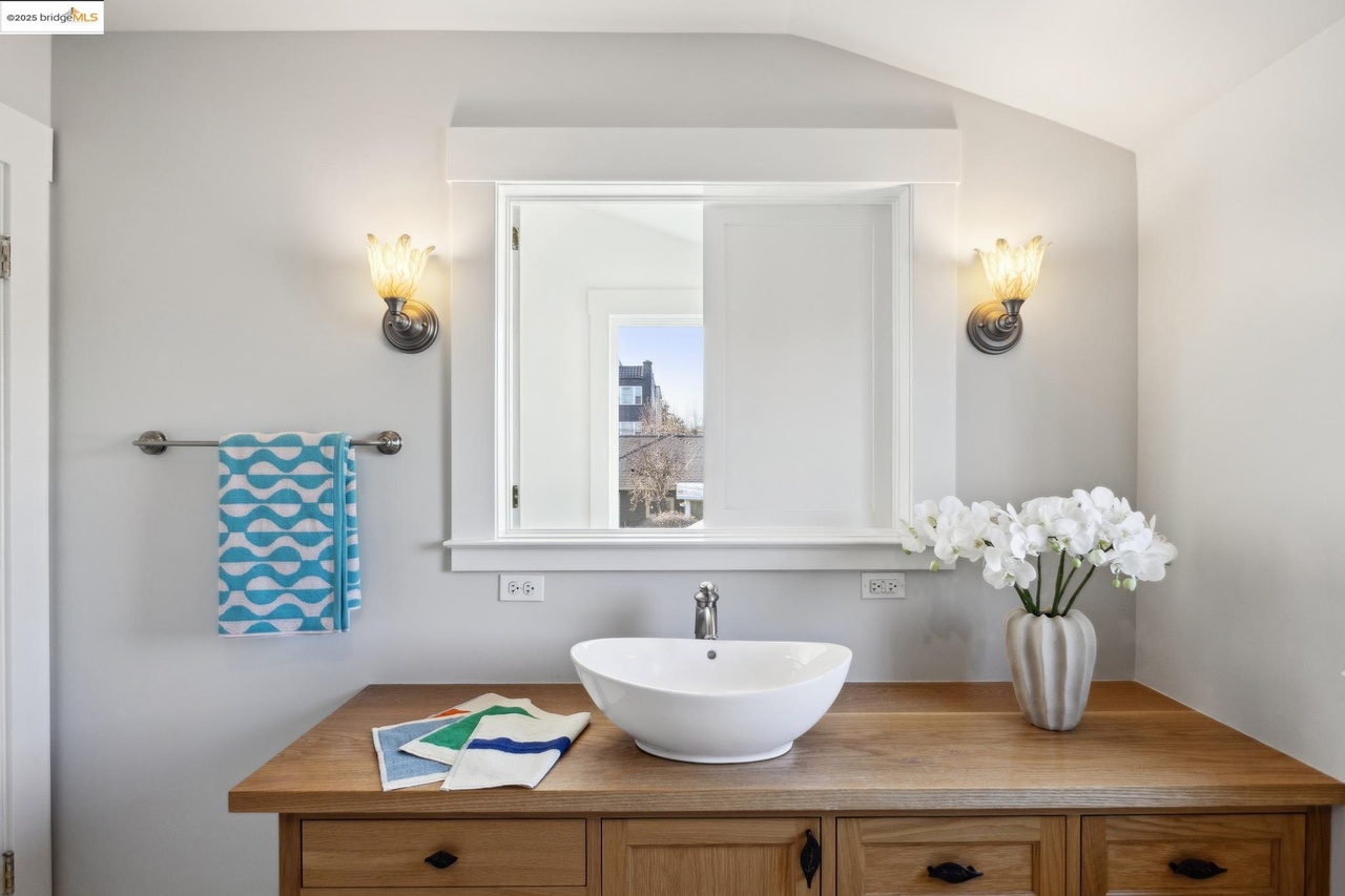 This is a photo from the upstairs bathroom and the interior window over the stairs (one shutter open.) I had thought we would put mirrors on the inside of the shutters, but owner didn’t want mirrors. This opening to the stairwell allows the bathroom to be filled with southern sunshine. Oak vanity by Aaron Larsen of Xylo Interiors. The vessel sink allows the vanity to be lower and nicer proportions.This is a view from the kitchen to the back….showing the light-filled stairwell and the french doors to the yardartistic shot looking down from the top of stairsExisting first floor – view from kitchen is of the laundryBetter connection to yard and south light. Laundry tucked out of view and staircase is nice to look at. (The garage is on that side of the yard close to the house)Second floor – you can see the opening in the bathroom over the stairs opposite the south facing window