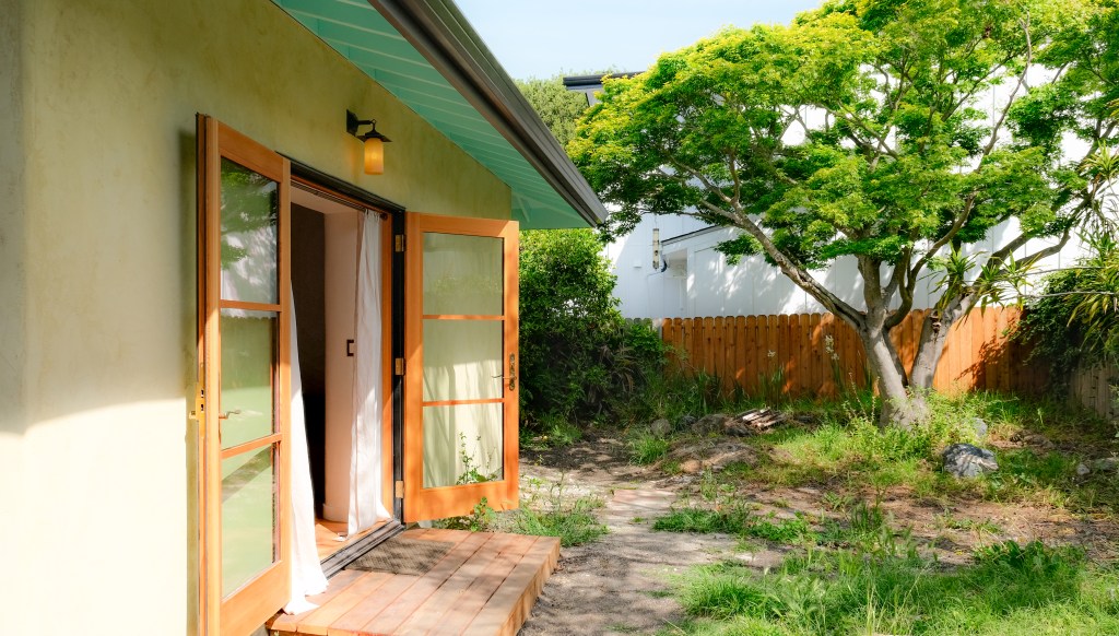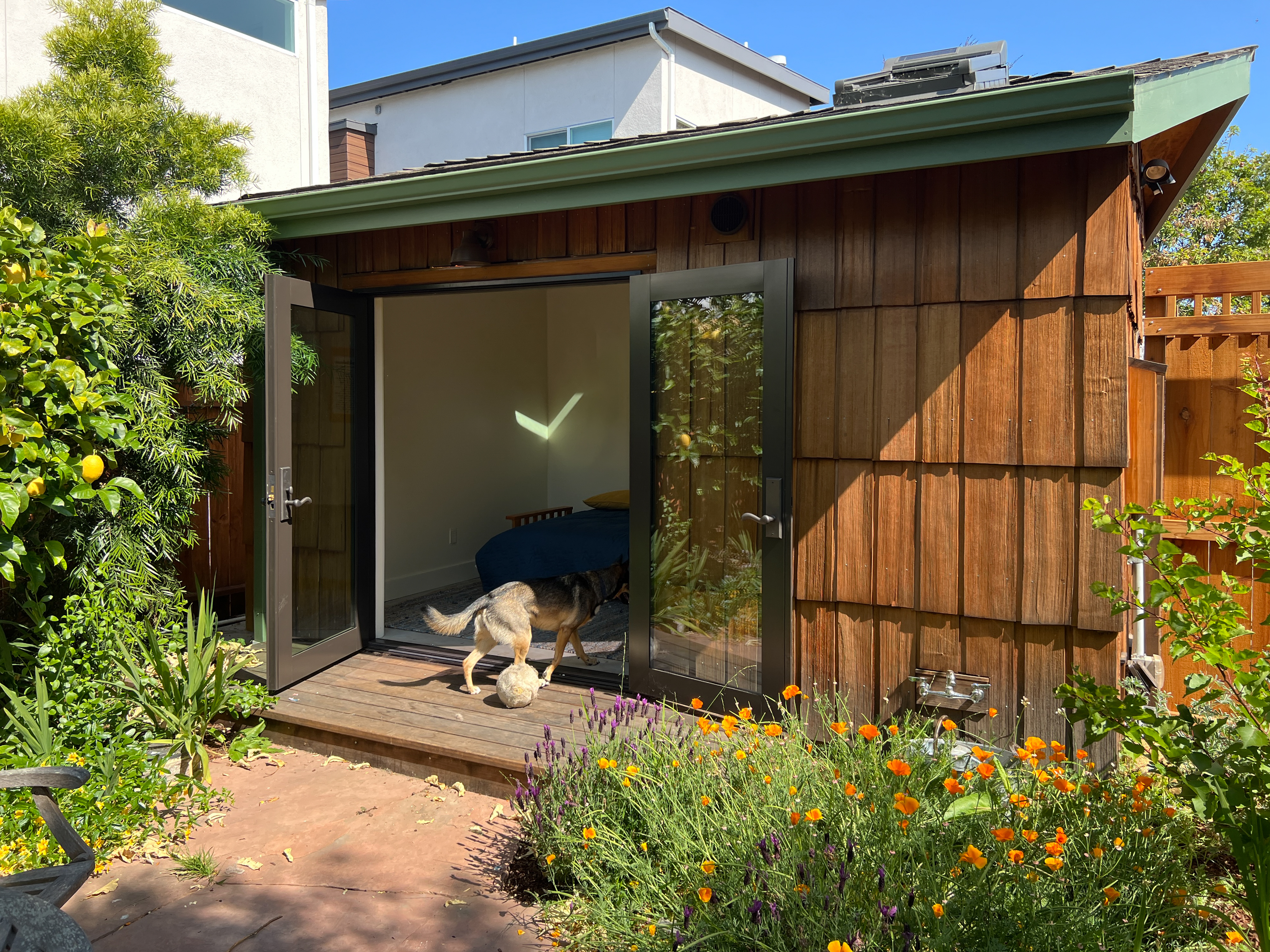 This ADU is 160 SF. Backyard is small and client chose not to move the ADU to 4′ setbacks and enlarge because it would make the usable yard even smaller. It was quite challenging to fit all the Accessory Dwelling Unit requirements in such a tiny space. We got the redwood shakes from Humboldt county, Doors are Blomberg and the high performance skylights have exterior shades.