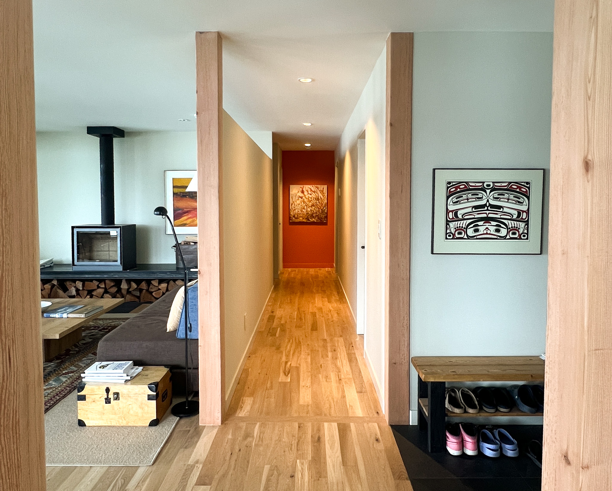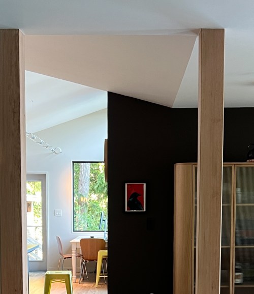 View of the house from the water. we simplified the roofline and deckView from the gate – Red windows and trim on this side to give it some personality from the road. New cedar entry porch with benches was a big improvement for easy access for all. (Old one had uneven stone steps down from driveway then back up several steps to the porch.) (I & AI added the ferns to the photo in the foreground, and strangely also a fish amongst the ferns) enjoying the viewBC Ferry Salish Heron with Mayne Island, Prevost Island, Pender Island, and The Olympics beyondEnjoying the viewLong south side covered porch. We eliminated the non structural posts that went to the roof and did not miss them despite my concerns that it might look odd without some posts. Enjoying the fir postkitchen transition to living and dining room – vaulted ceiling to flat ceiling. This was a tricky structural bit for the builder because he had to modify the existing trusses and I am thankful that the owners saw the value in making the transition what it should be rather than the easiest way. Kitchen counters are Paperstone – made from recycled paper and both warm to the touch and acoustically dampening. Livingroom – My favorite detail is the steel beam supporting the wood stove shelflooking downtown the bedroom hallway – we made it more private but kept a slot at the top of the wall to let light through. Aimable recessed light at the end illuminates a painting. Looking past entry toward kitchen – ceiling transition and four fir posts creating an elegant transitionmoonlight and ferryInterior window detail – painted wood jamb on all 4 sides. Another view of the window detailRelocated stairs to the lower level. (Old ones were in the prime real estate between kitchen and dining room.)