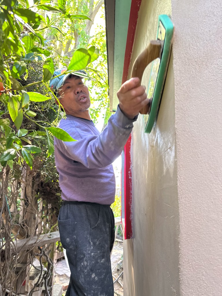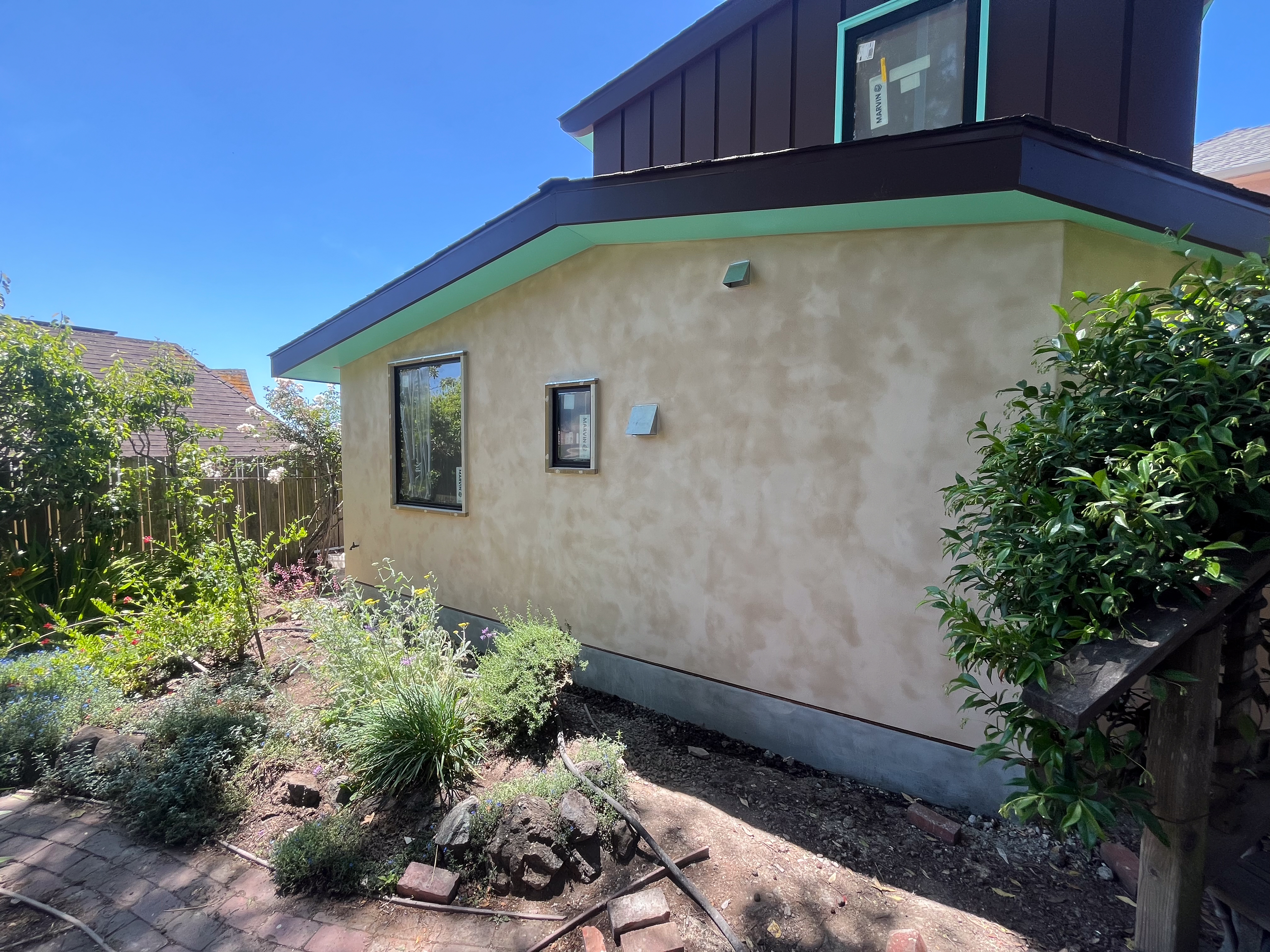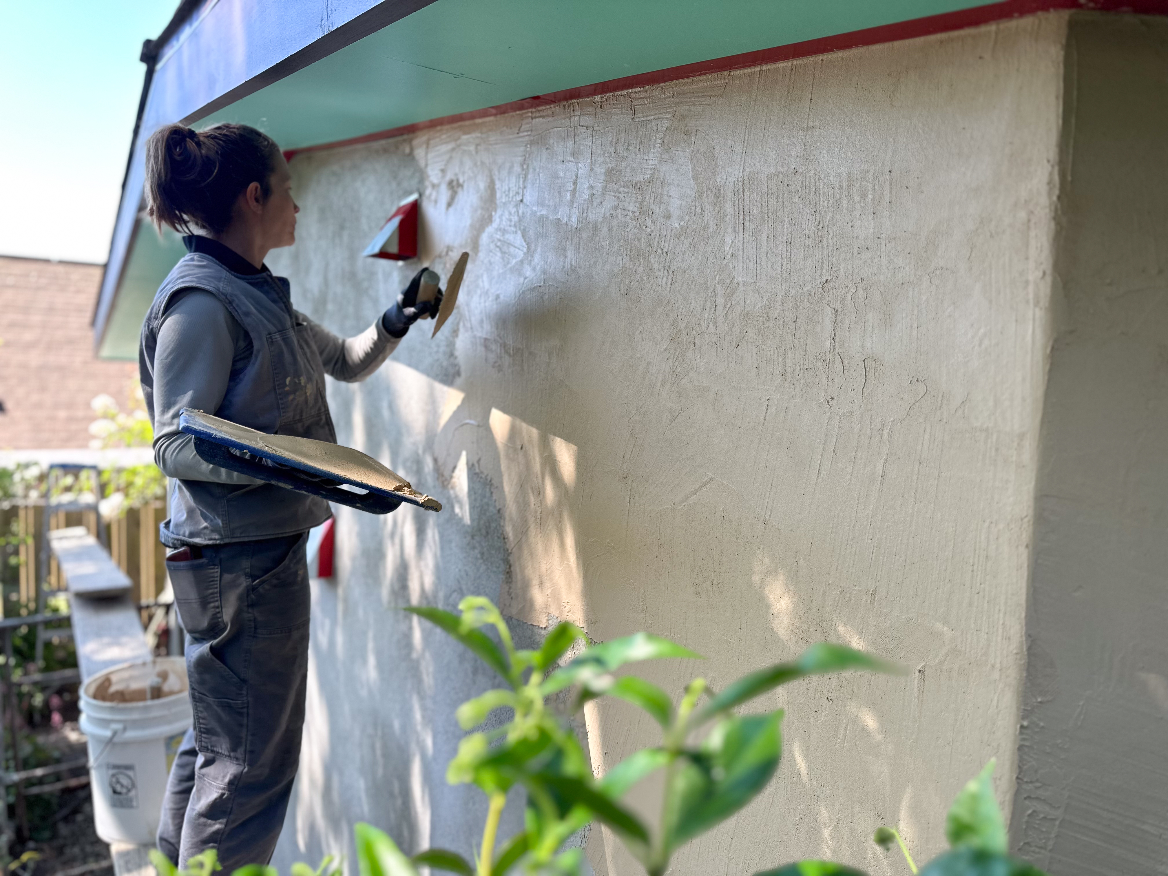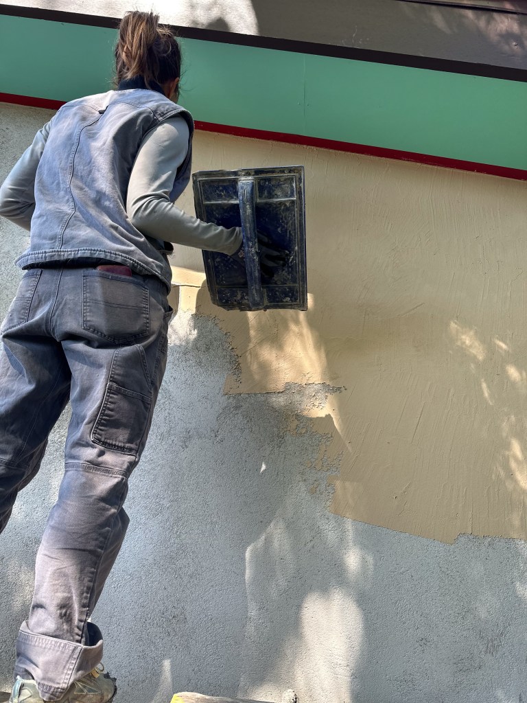 Here are a few exterior shots of the integral color plaster walls. Action shots of the plastering team at work courtesy of Michael Scott.