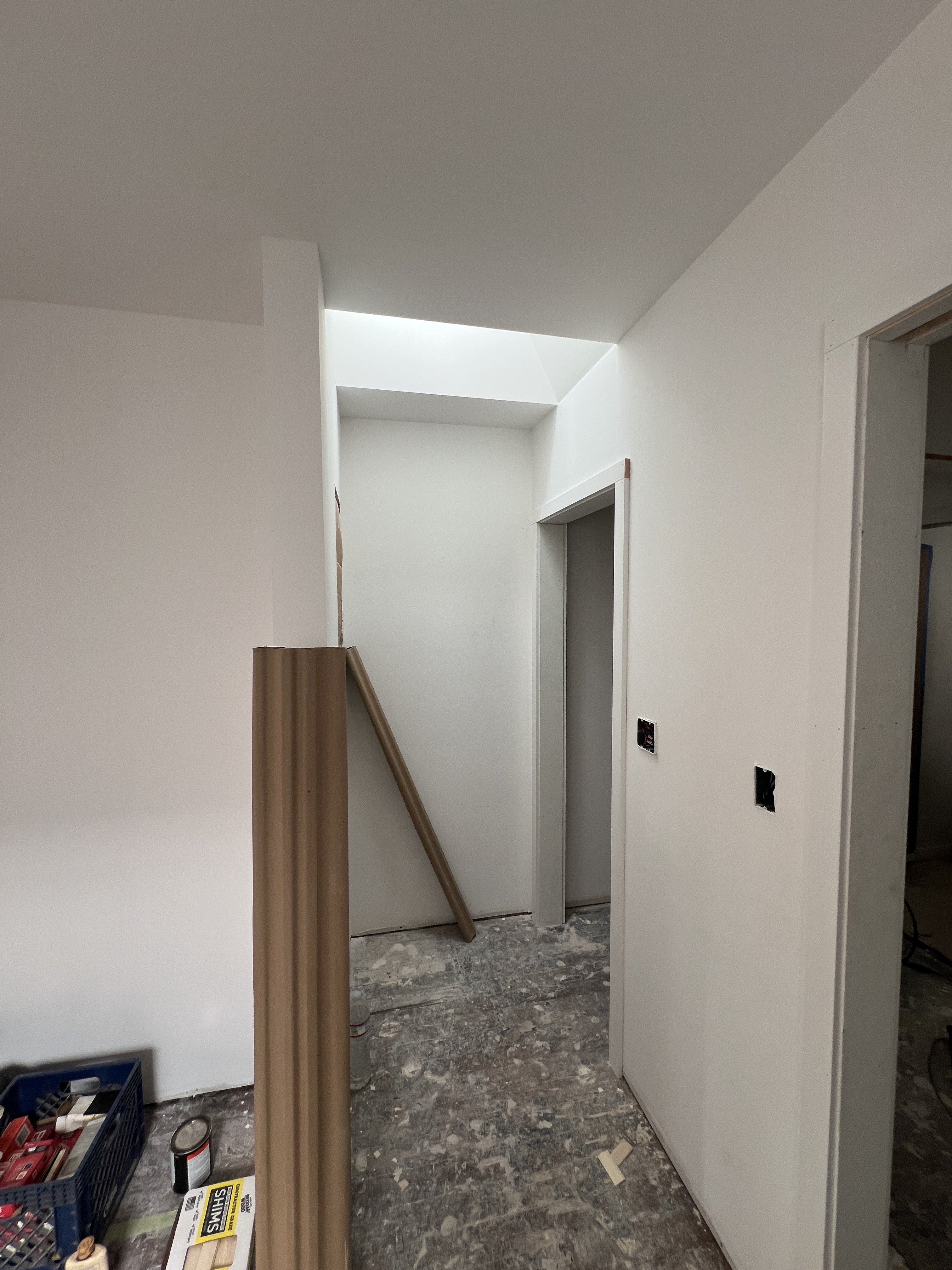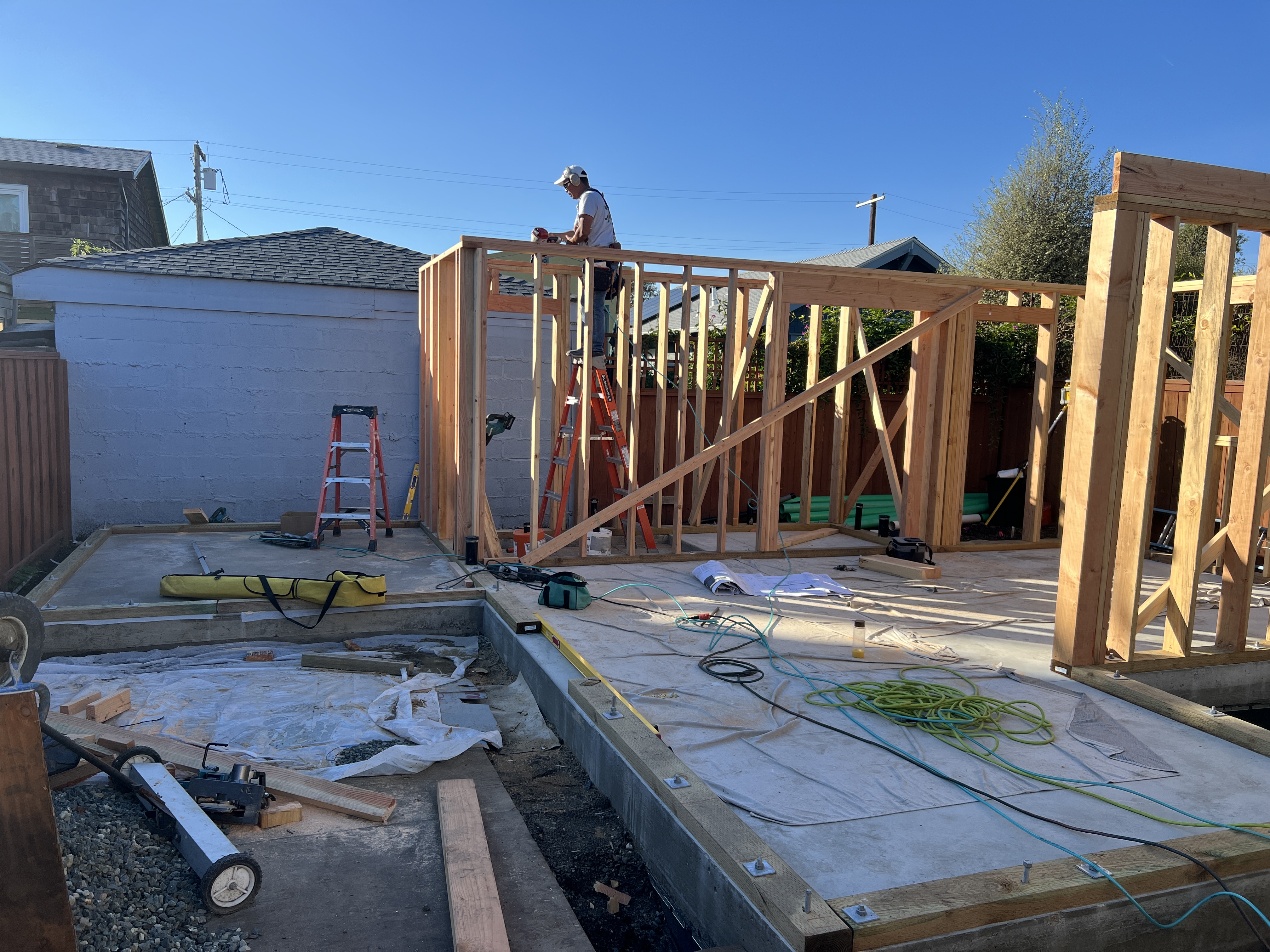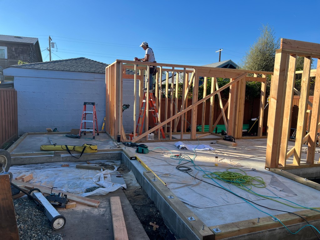The slab was poured and beautiful saw cut control joints added. Now the structural framing is underway. The tolerances are very tight in these small living spaces. Every inch matters. I was delighted to discover that the concrete work and framing has resulted in walls that match my drawings to the 1/16 inch.