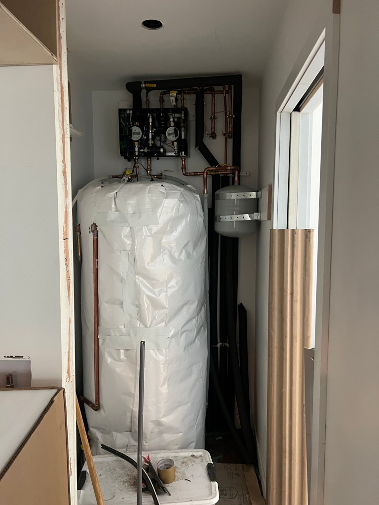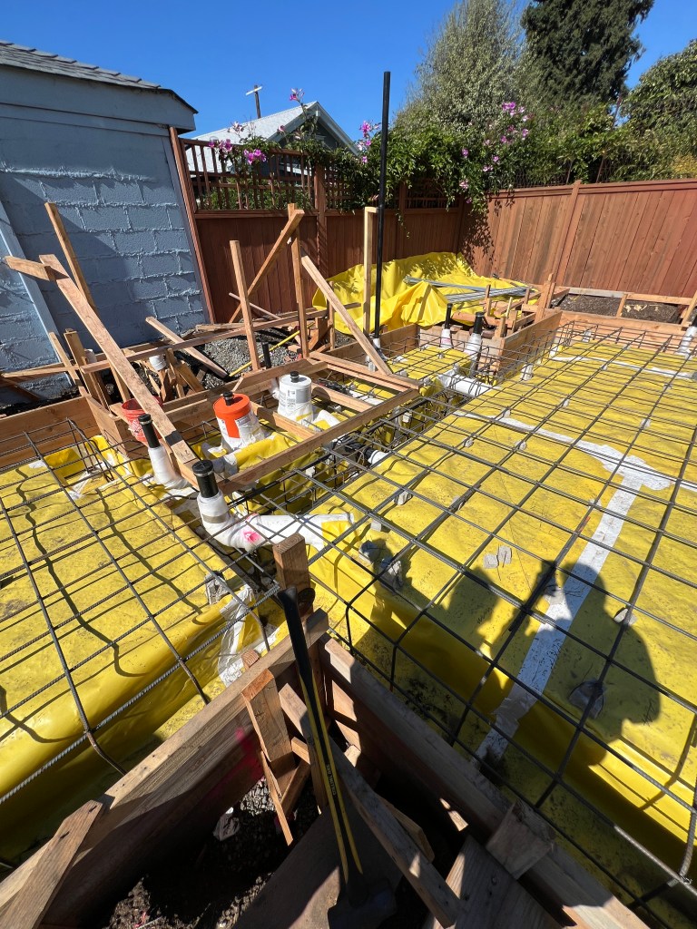 Copper induction range with battery and walnut knobs (Berkeley company!) SANCO₂ heat pump hot water heater (tank inside, heatpump outside) that doubles as house heating system (Harvest System) ADU slab..getting ready for the concrete pour