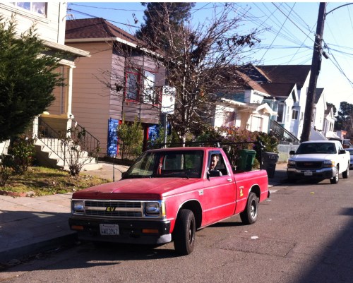 Contractor Eric Angress arrives in his red electric chevy