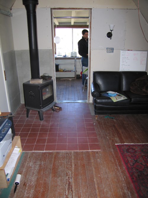 This is the best “before” shot I could find. It is from several years ago before the sheetrock was finished. The woodstove protrudes past the kitchen door and the tile hearth is a huge square chunk out of the room and also a tripping hazard