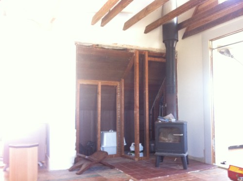 Framing for the rearranged closet and the wood stove niche. You can see Frodo’s litterbox already installed in its new location. We installed a private entrance to the back of the closet for him