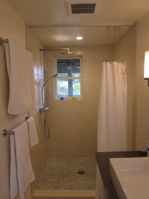 Basement upgrade in the Berkeley Hills » big shower with hospital style curtain