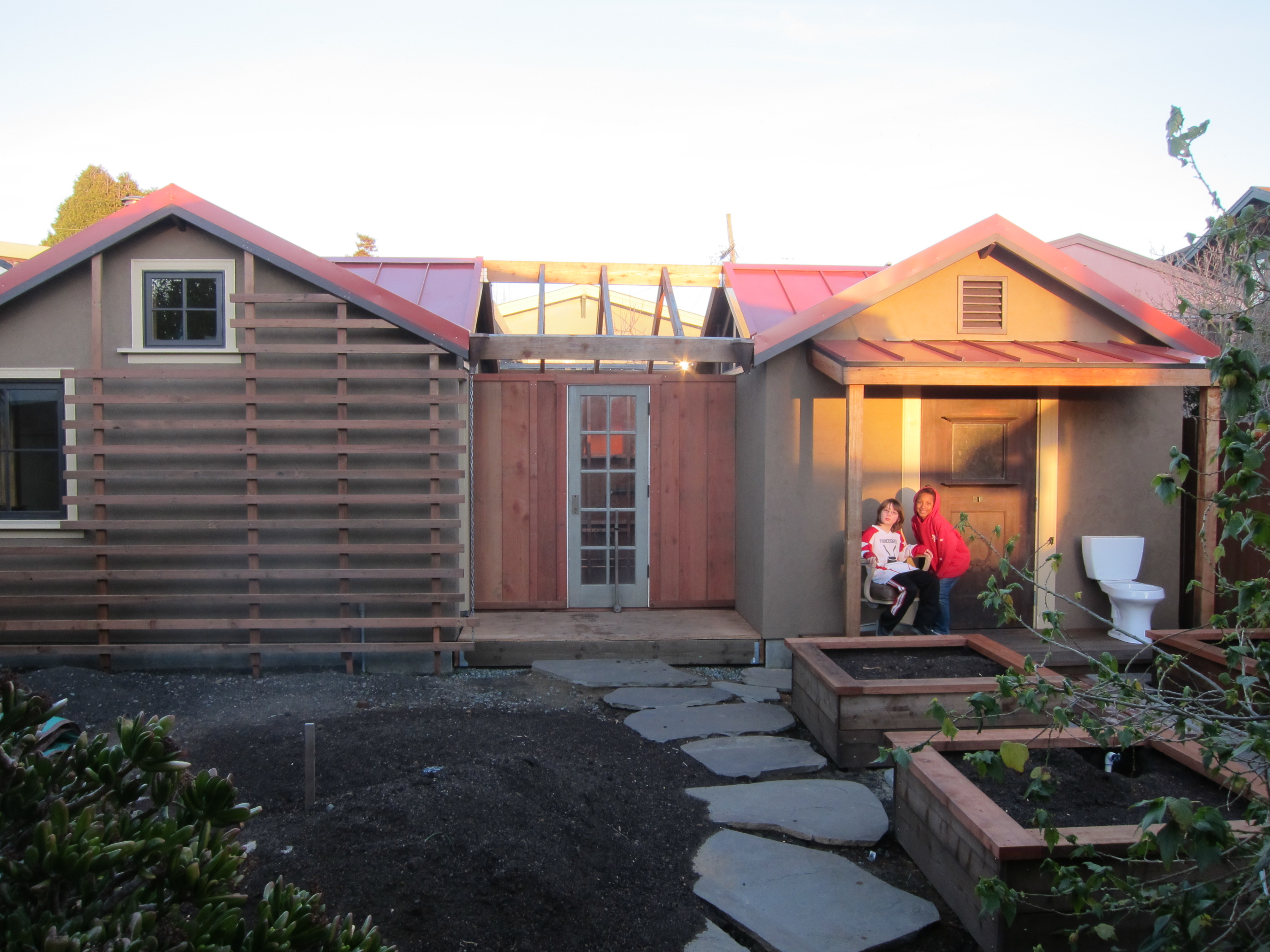 Matt has the trellis underway (on the left building.) He plans to train a rose to grow on the redwood slats. Mavis and Atticus try sitting on the covered porch in the evening light.
