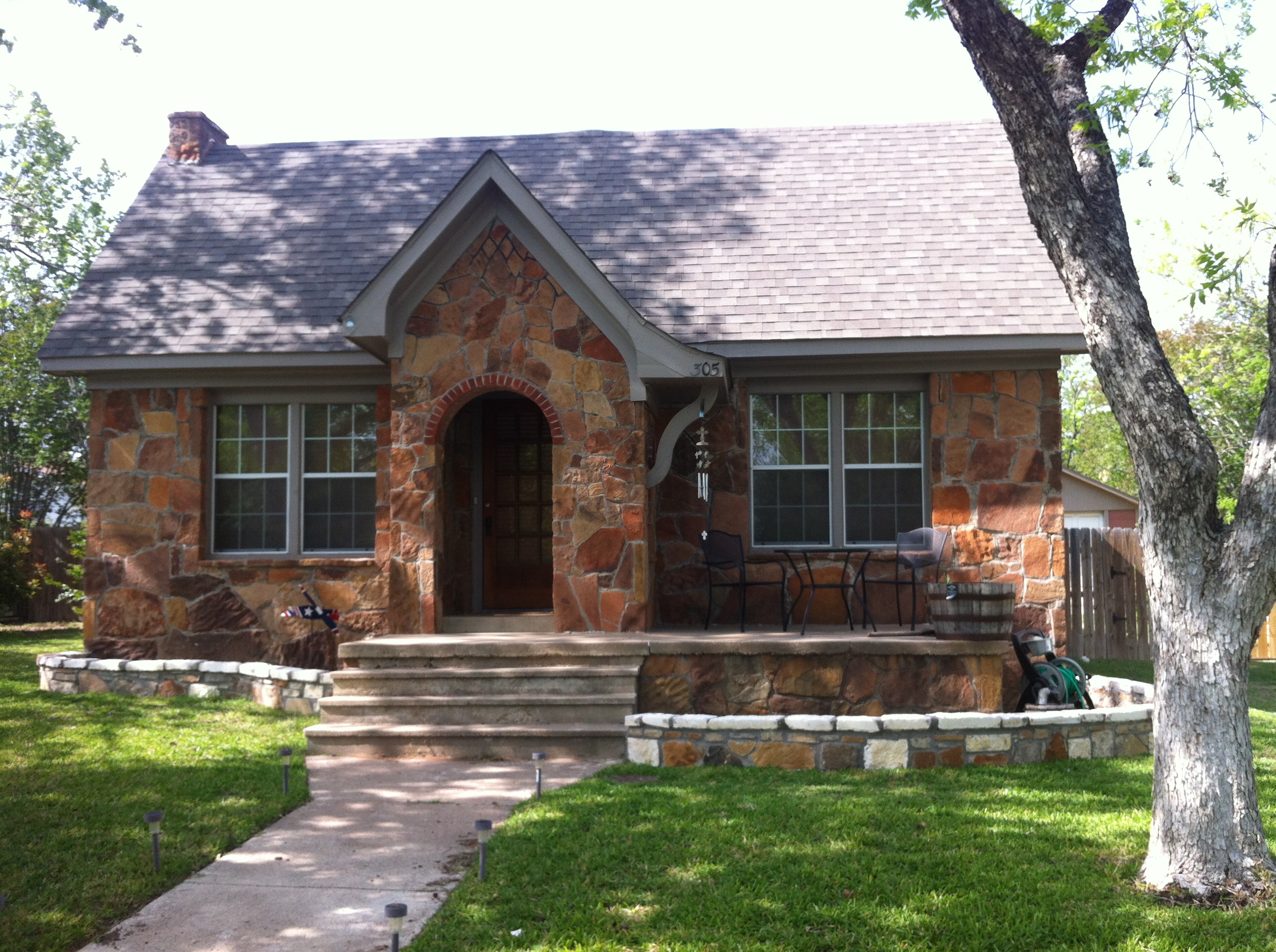 A sweet little stone house – I like the red brick arch, and the stone is very pretty. The curves are nice, as is the white stone on the lower wall