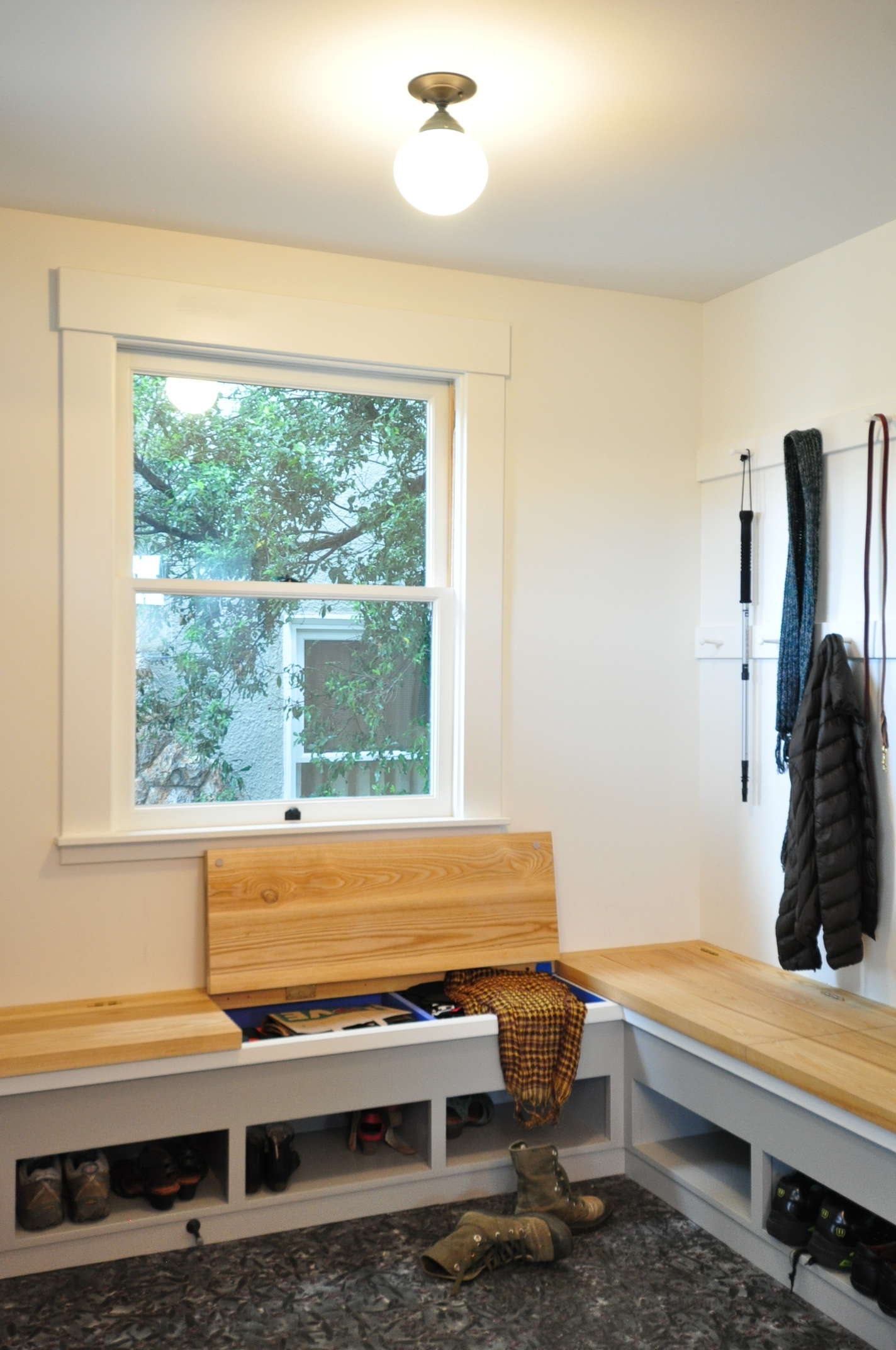 There is a spot for everything in this mudroom – Shoe cubbies below, ample storage for scarves, dog leashes, hats, and bags under the bench seats (solid ash), and lots of pegs on the wall.