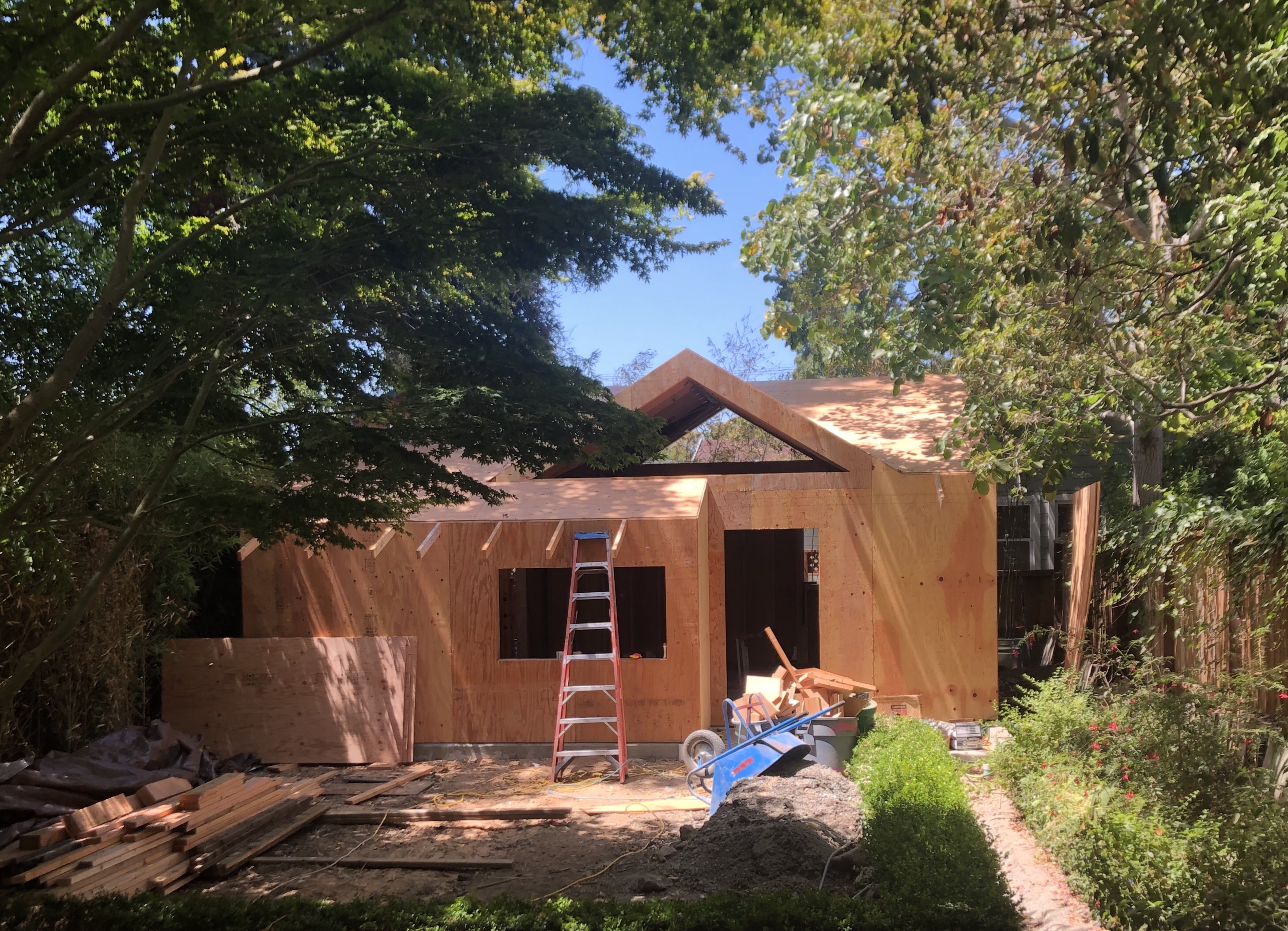 McBride Construction (and others…foundation by Caliber Structural and rough plumbing by Braco Plumbing) have this 484 SF ADU well on its way . It’s nice to see it take form. You can’t see one green innovation that is hidden under the slab. Instead of rigid foam insulation we used rigid rockwool. Concrete is high volume flyash. The framing lumber is FSC certified. The building will get a blower door test and it must meet a high standard for air tightness. (You can still open the window or turn on the ERV for fresh air, but your air won’t be trickling in through dusty cracks and crevices) Stay tuned for more. .
