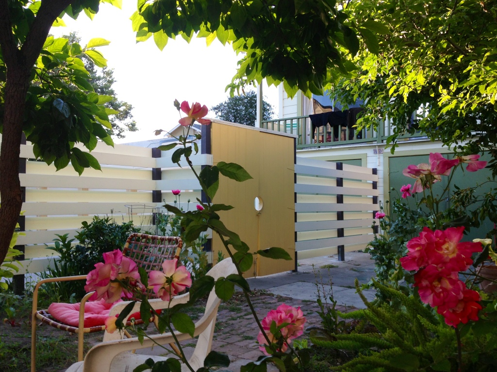 Two fine artists in Alameda own this lovely garden and fence. Not overly concerned about security, they made the round cutout in the yellow gate for easy access to the latch