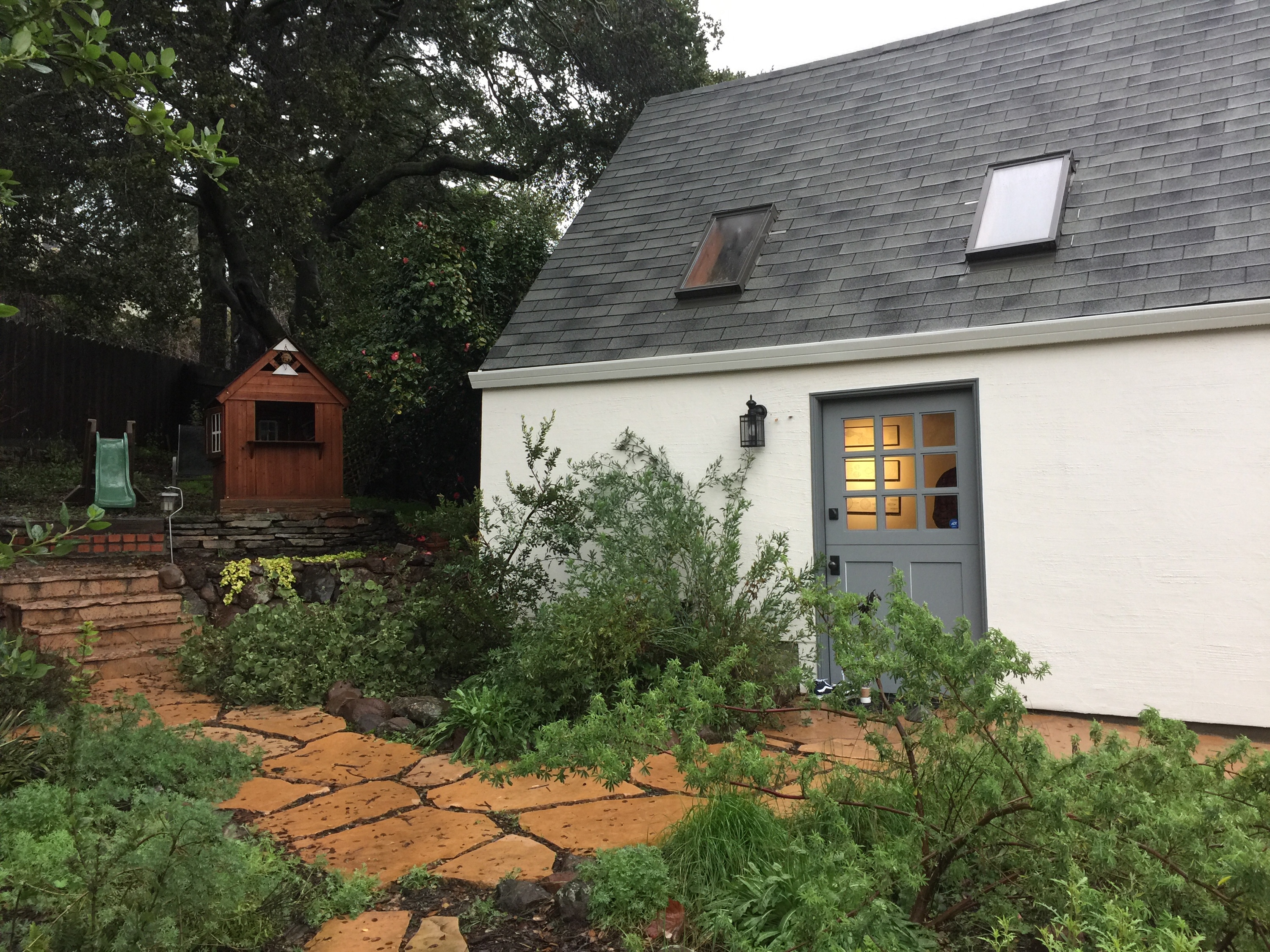 I thought I’d shared a couple more photos of a recent remodel project. This Berkeley house was built with no way to get to the backyard except through the house or from the neighbor’s driveway. We decided to add a pair of dutch carriage doors on the back side of the garage so that there would be a direct connection from front yard & driveway to back. The owners will probably use the garage as a room, rather than a garage, but the design allows for a variety of interpretations (In this mild climate we don’t really need heat to make a room into living space 3/4 of the year or more) The existing concrete slab was polished smooth and shiny for a practical upgrade.