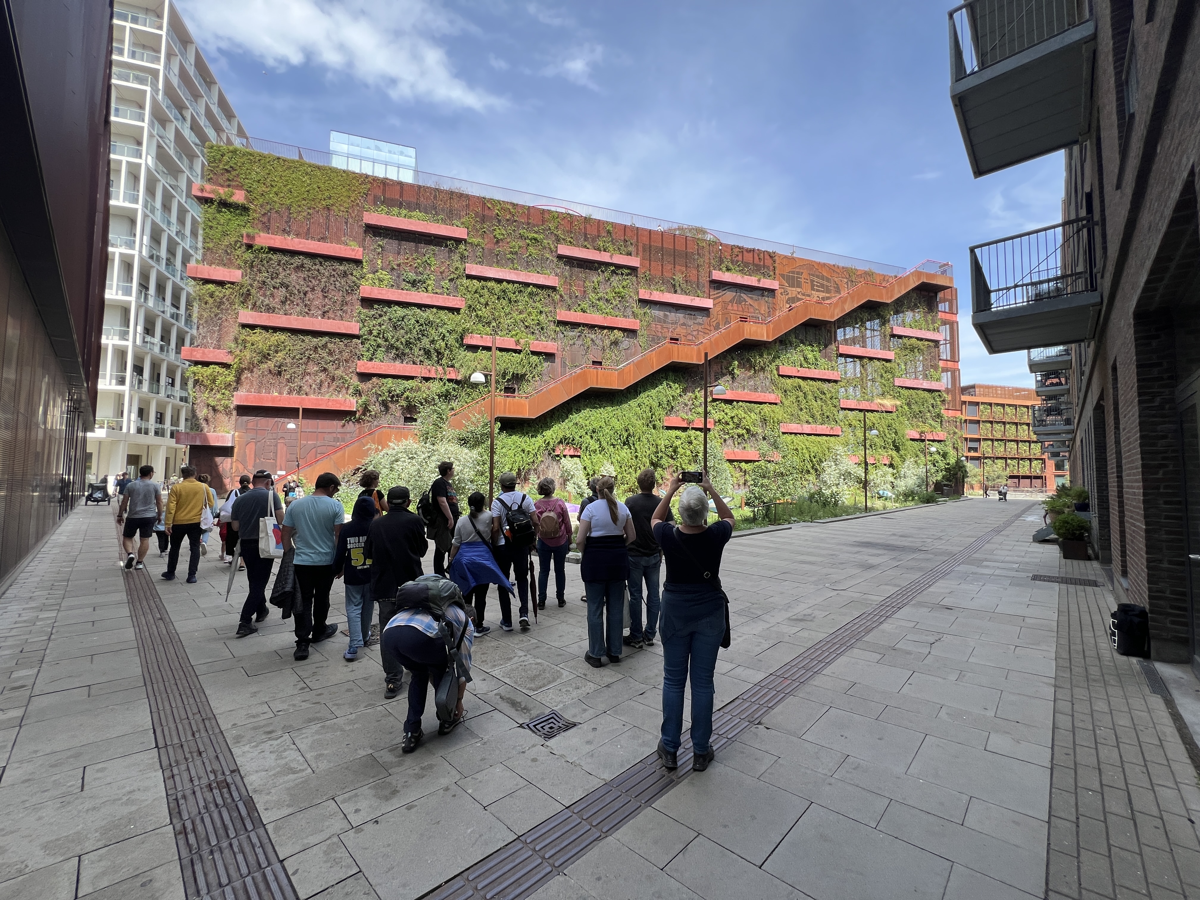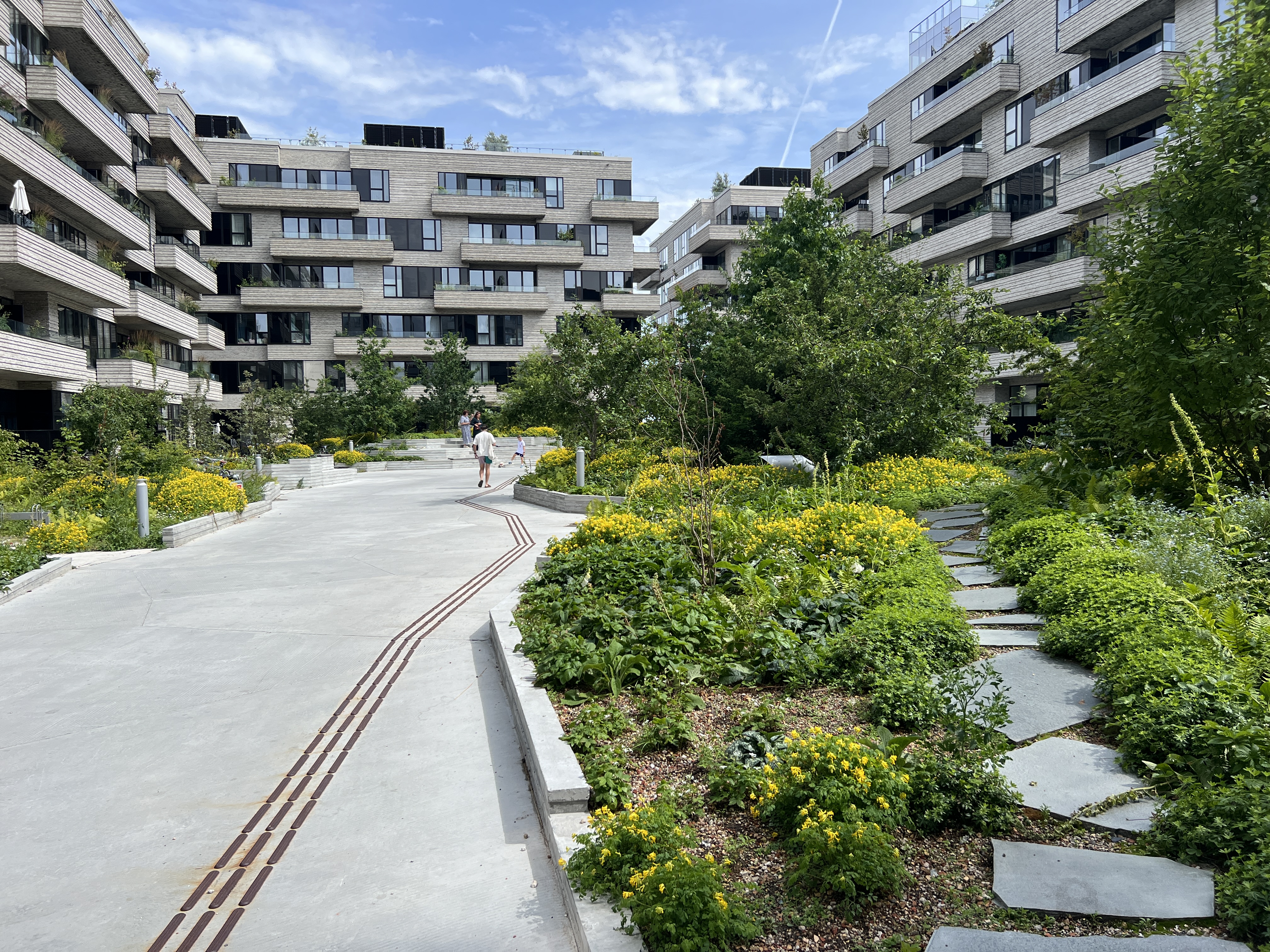 Also in Copenhagen we went on tours of some of the newly developed mostly residential areas…in particular, Nordhavn, which used to be a port and is now mostly apartments. Our tour guide told us that this and other newer parts of Copenhagen are built on what was once water. She mentioned that the master plan included both green space and blue spaces for enhancing the human environment – regular parks (green) and all sorts of connections to the water and uses of the water for transit, swimming, boating etc. (blue) Lots of mention of environmental certifications, and we also toured a very nice recycling/reuse facility. Nesting sites for 3 species of bird were incorporated into the roof of one tall building. The courtyards and other outdoor spaces, (blue and green) were mostly quite nice. We were wondering about impacts on the greater environment, wildlife, of expanding over the water…and how they were preparing for sea level rise. Multi family housing is already more energy efficient than single family houses, but we were told that most of these buildings incorporate many environmentally conscious features, but that wasn’t the focus of the tour. We did tour a very nice recycling and reuse facility serving the neighborhood. The entire waterfront is public space available to all residents and non- residents.
