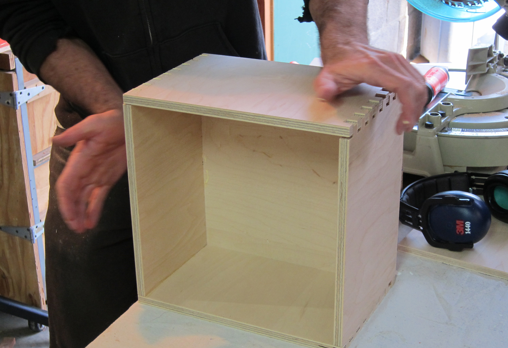 Sometimes, when working in the driveway, people stop by to check out the action. I think John is explaining the cabinet to our curious neighbor here. He now has all five boxes assembled and primed. Here are a few more pictures of the process. Even though these boxes are painted, the woven corners show through and add a nice detail. Stay tuned for the final product.