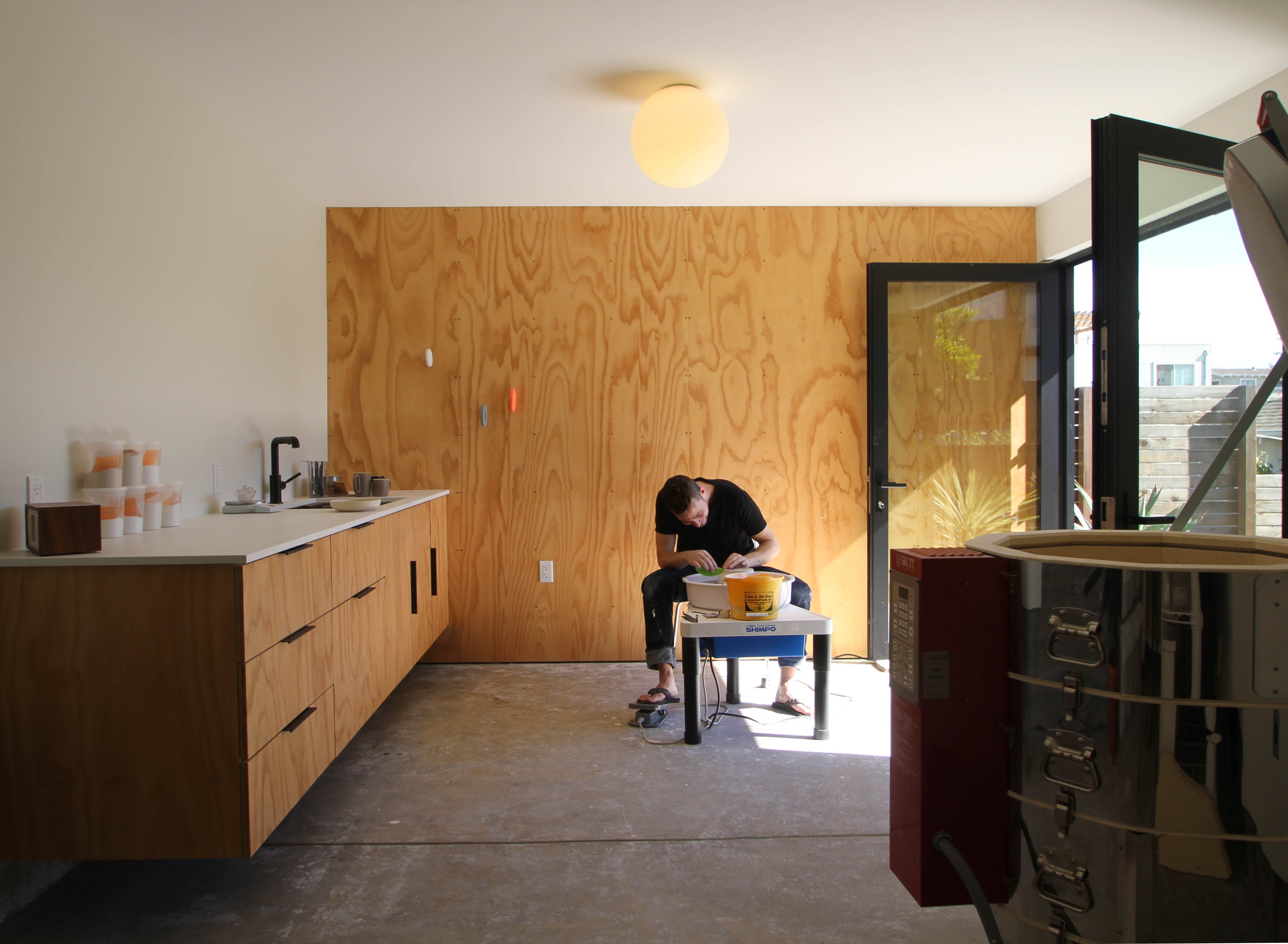 Other features of affordability and style are the colorful plastic laminate counter tops with 50s style metal edge banding, the beautiful green Marmoleum floor (you’ll have to just believe me because you can’t really see it in the photos, & the open space for art that is available because the client didn’t squeeze in as many upper cabinets as they possibly could.