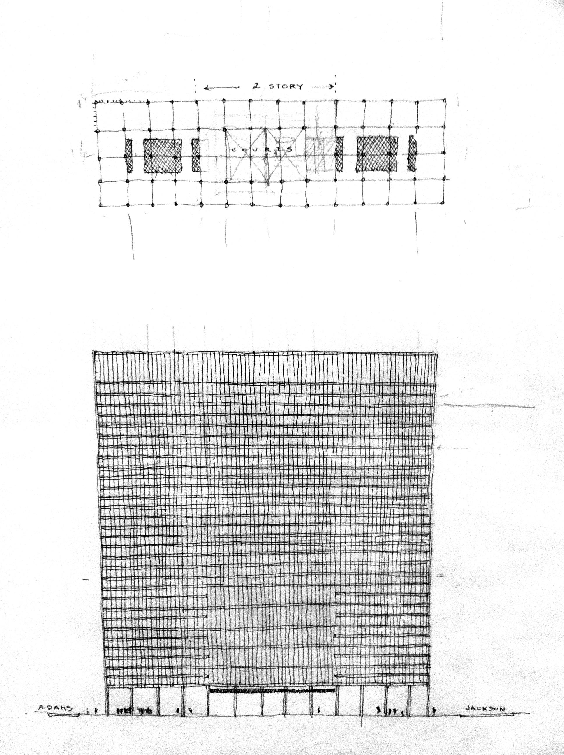 I worked on a studio project once with a German exchange student whos drawings looked a lot like this. He was very smart and I liked him, but he was not an overachiever or a workaholic. He kept things simple in part because it was easier that way. On the other hand you’d probably say that Mies showed remarkable restraint and that to achieve minimalism he spent long hours honing things down to the barest essence, making all the parts speak together in unison with no part left unconsidered. Less is More.