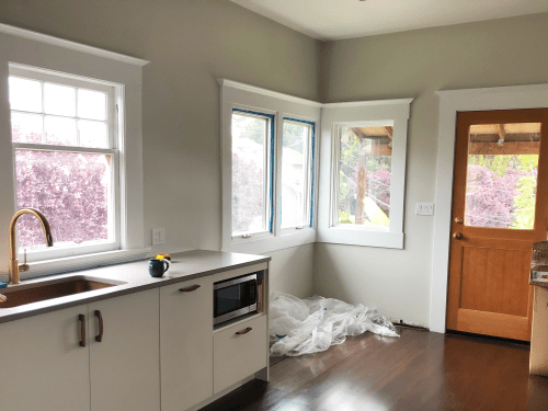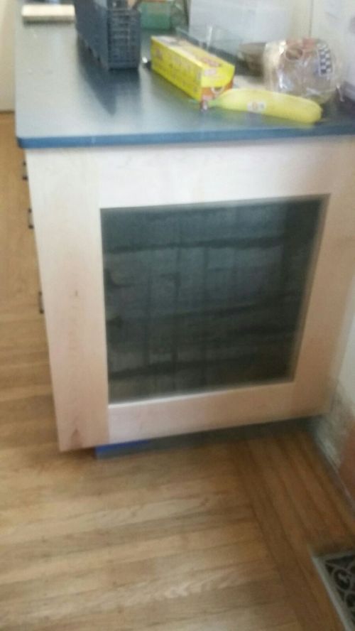 Another kitchen with a new very simple refrigerator side panel and high cabinet to hide the cereal boxes. The side panel is a great spot for a pot rack!