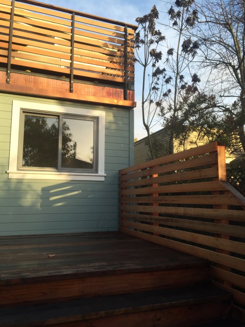 Cedar slat railings above and below, energy efficient wood-clad windows and copper gutter and flashing.