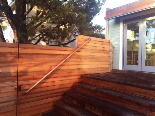 Copper Handrail, cedar fence & gate, Copper gutter and downspout above