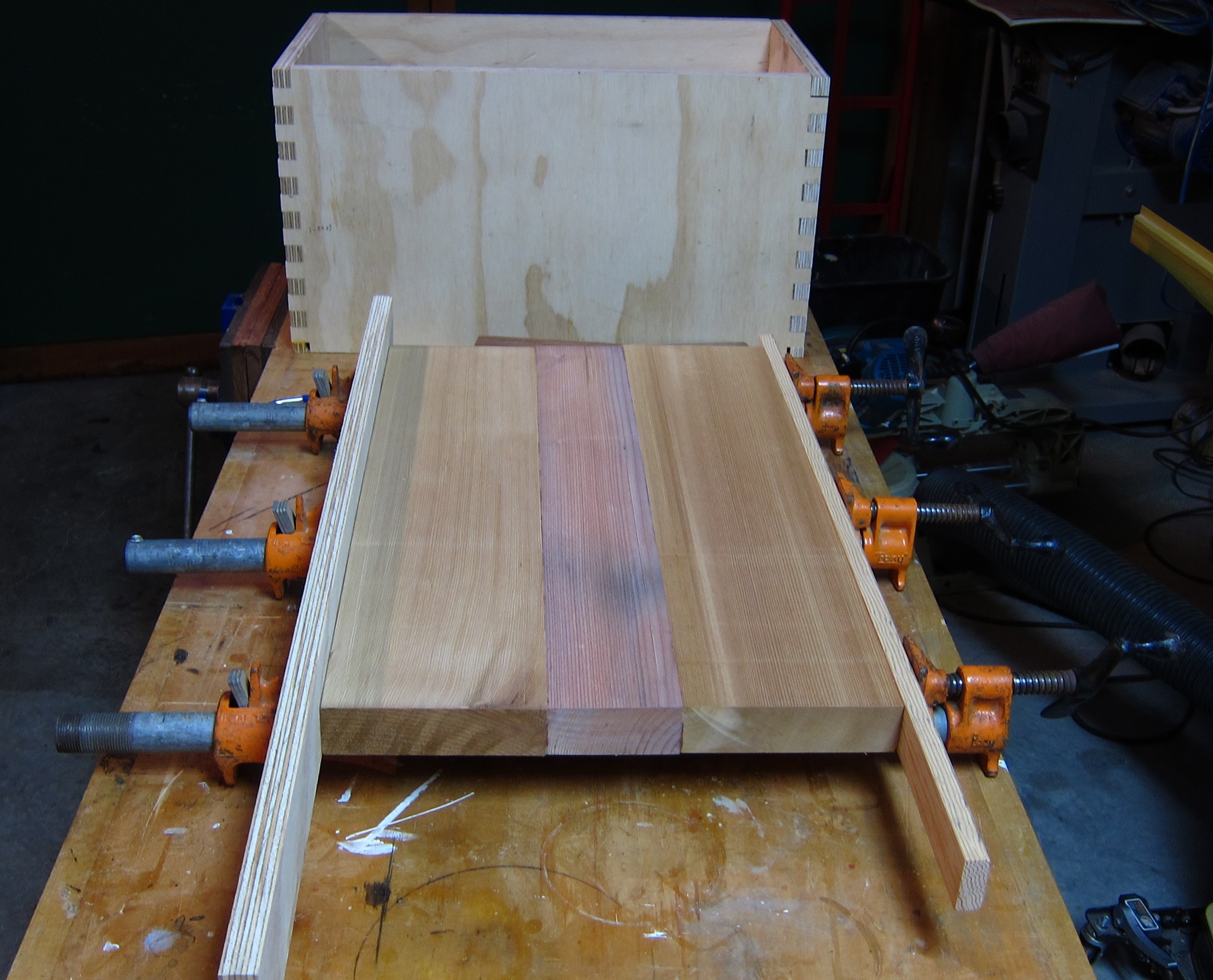 The lid is made from two fir 2×6 scraps and a redwood 2×4 scrap that John brought home from his job site. Better than average specimens, with fairly straight, tight grain; they are probably from appearance grade stock. I did not have a planer on hand, but they were pretty straight and flat. I used my new jointer to make edges flat and perpendicular to the faces. I also used the jointer to clean up the faces. (This is usually accomplished by a planer) Then I glued and clamped them together as shown in this photo.