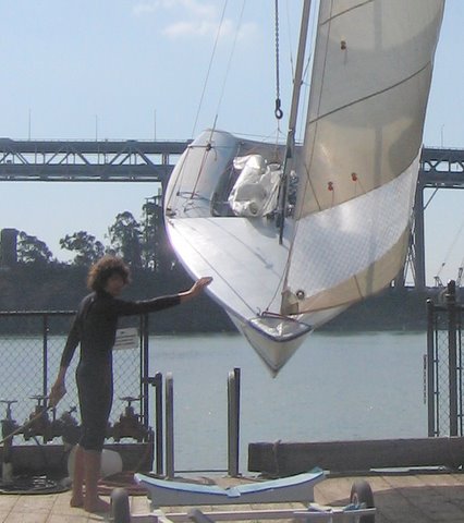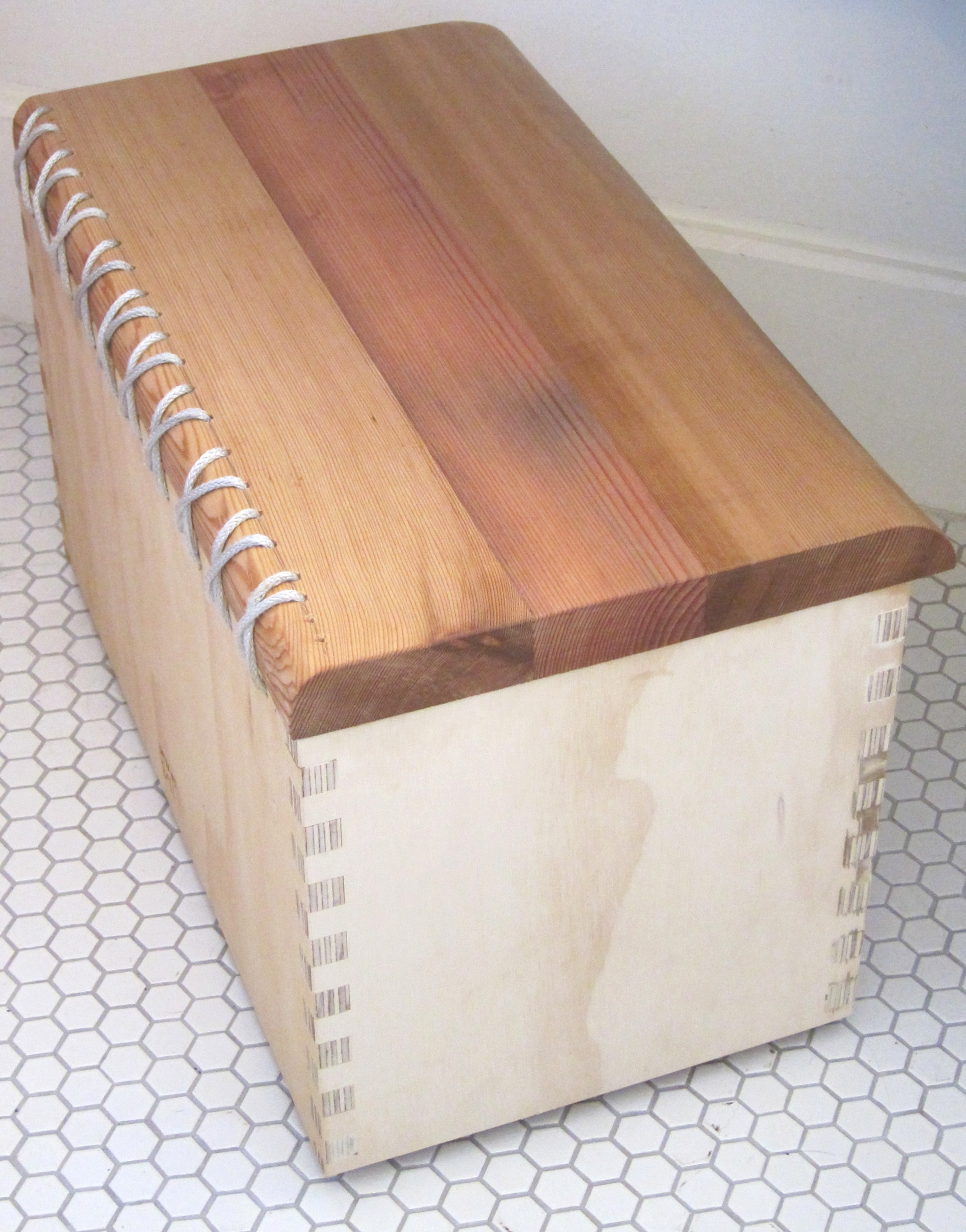 I’ve made progress on the prototype. The lid is installed. I fashioned a hinge out of retired spectra running rigging from the 5o5 Bar-ba-loot (pictured below). The hinge needs a little fine-tuning, but I like the Xs. I handcarved the curves in the lid. Nice soft fir makes for easy carving.