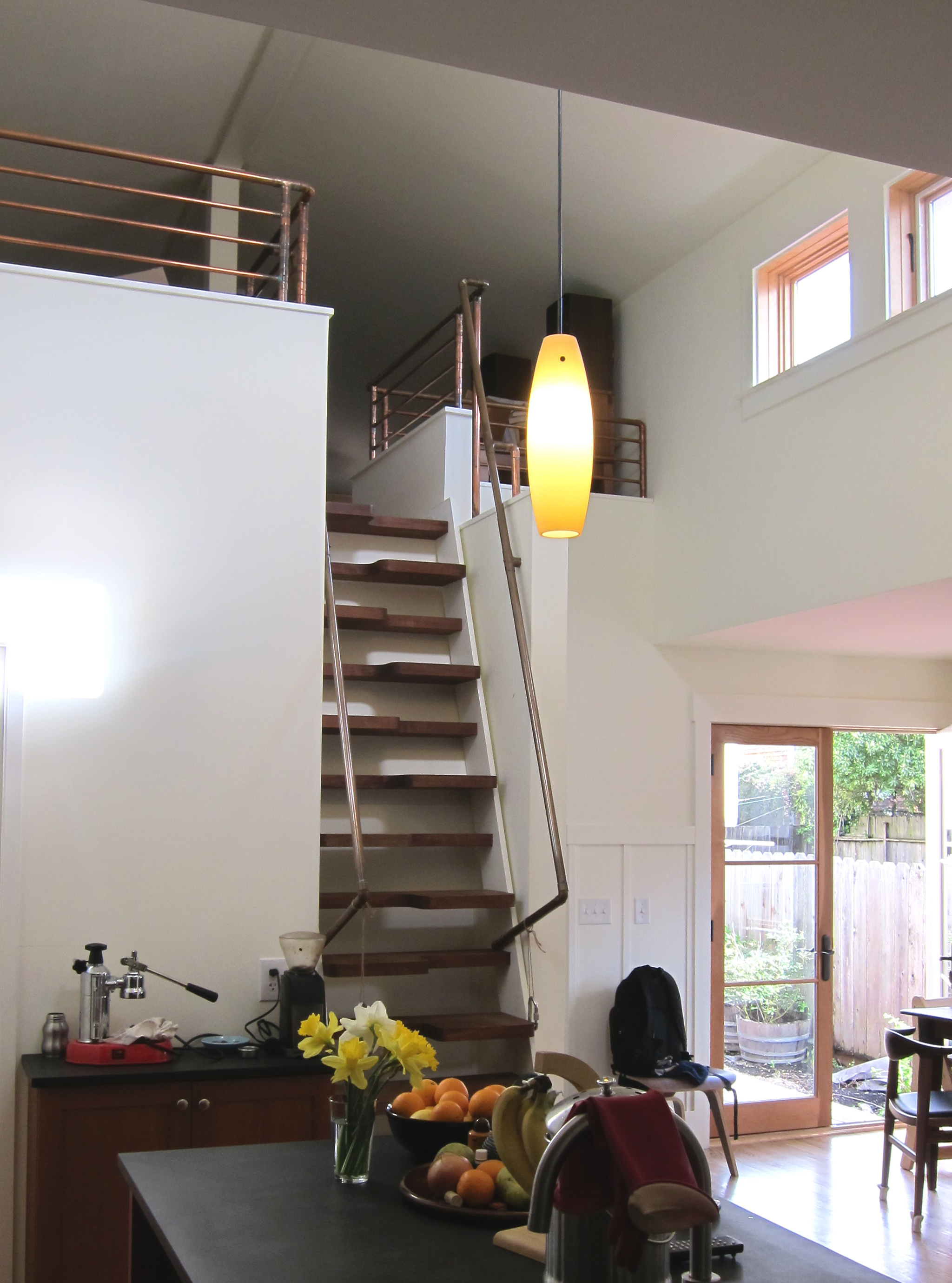 The Lapeyre stairs provide easy access to the loft above. We enclosed the loft with low walls to hide any boxes stored up there, but added open railings for the last 18″ or so. This way the required 42″ tall “guards” don’t seem so tall and a bit more light circulates.
