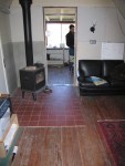 - This is the best “before” shot I could find. It is from several years ago before the sheetrock was finished. The woodstove protrudes past the kitchen door and the tile hearth is a huge square chunk out of the room and also a tripping hazard