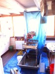 - Framing for the rearranged closet and the wood stove niche. You can see Frodo’s litterbox already installed in its new location. We installed a private entrance to the back of the closet for him