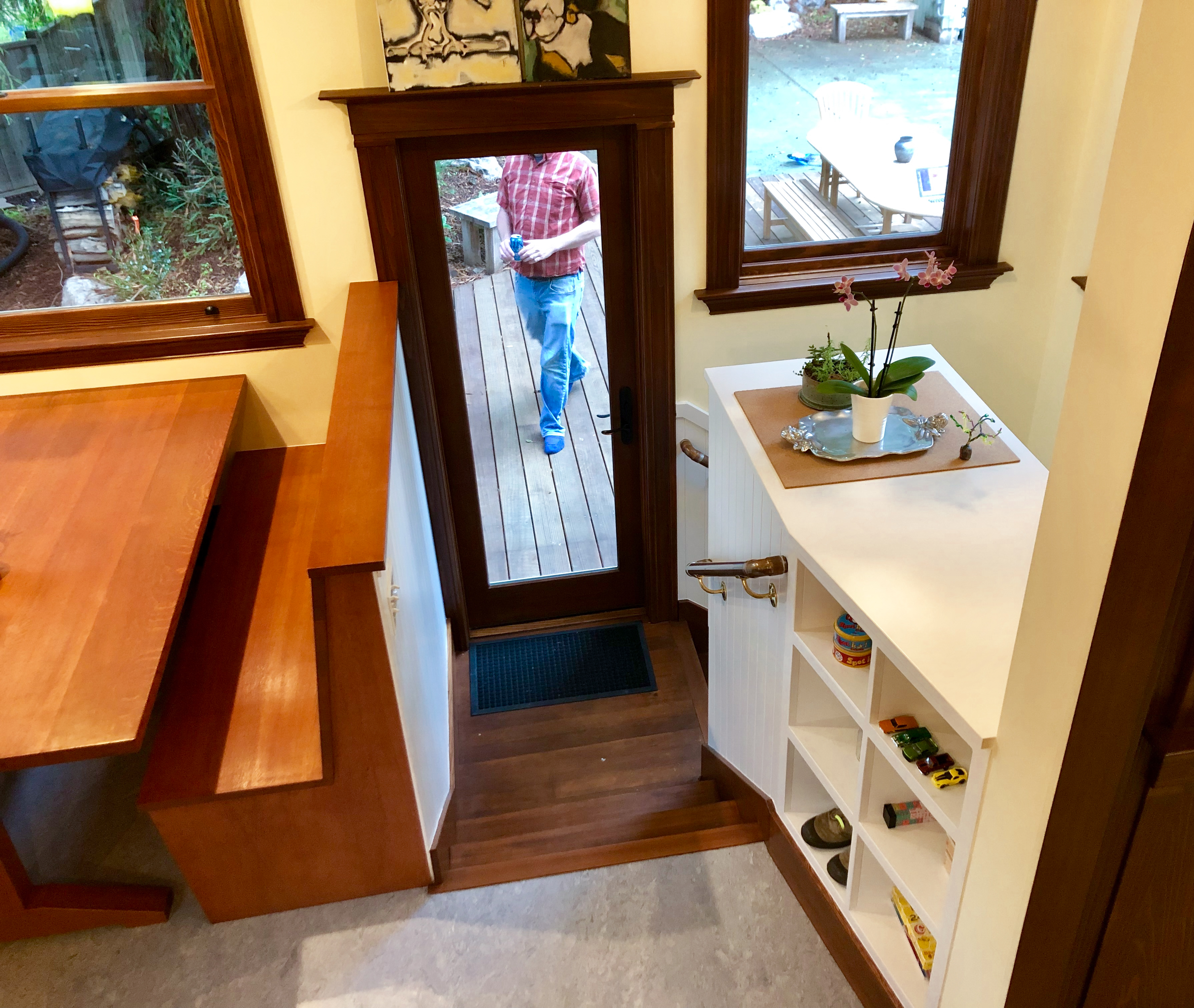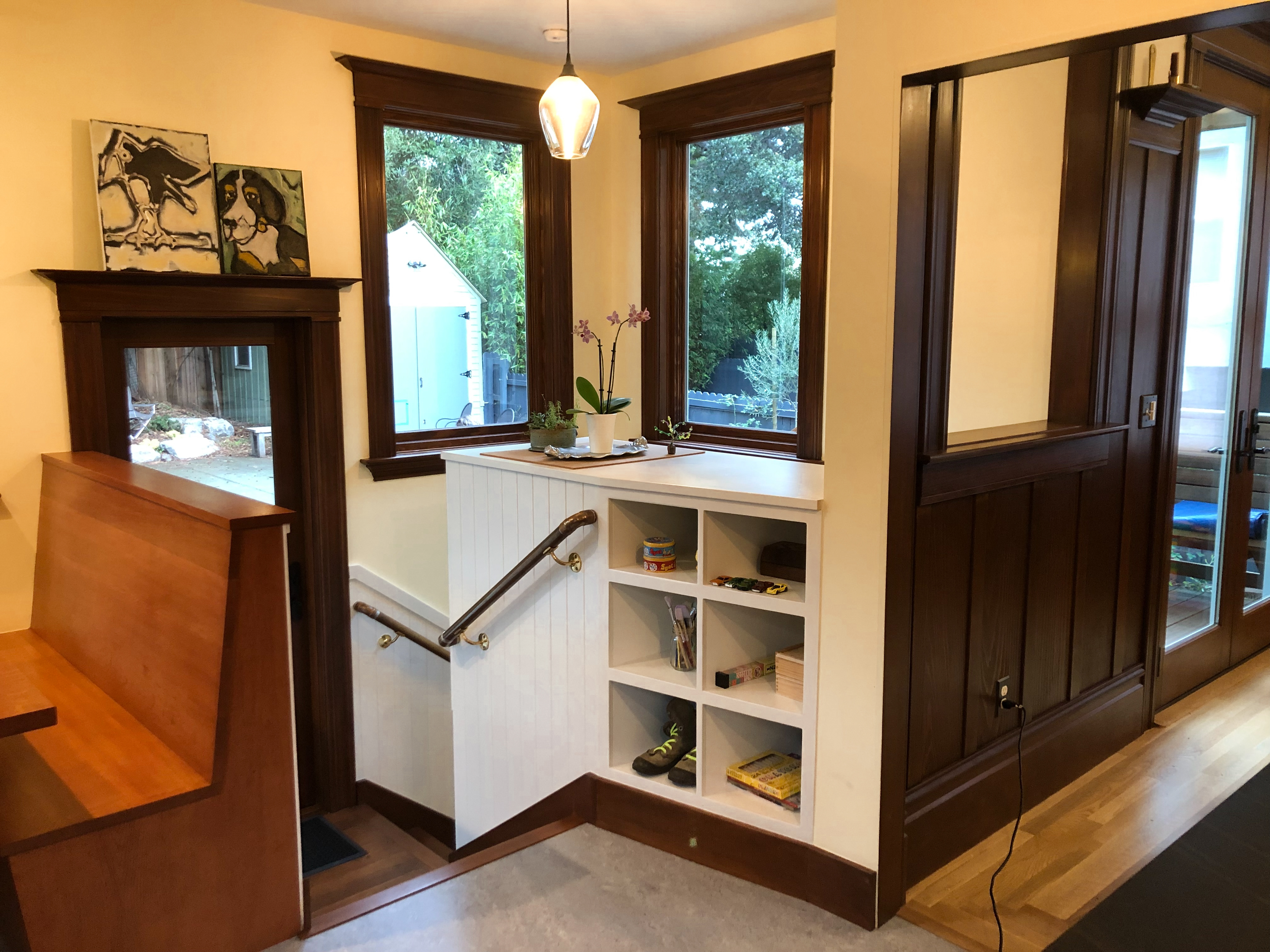 Looking down on the big room – I love the flooring – It is existing, structural tongue and groove fir subfloor, but it was lighter and kind of pickled with dark marine grade caulk/ filler between the boards. We thought of putting new flooring on top, but the boards were so nice and long, which is unusual these days. Once we put on the dark stain the super nice figured grain popped and we loved it. The indirect LED strip lighting atop the collar ties also worked out well. The electrician did a great job and knew to stop the lights a bit shy of the ends to minimize bright spots. (This photo accentuates the bright spots) Before shot of the flooring/ structural subfloor with younger Èowyn.I had a goal to be very particular about the clips for the shower glass. So often the clips are not given much thought and they ruin the simple clean look. (First I tried to talk the builder into no clips at the bottom, recessing the glass into the curb, but they were not game to try this detail. The green floor tile is Arto and the shower floor and walls is Fireclay.Èowyn likes the big window looking into the woodsI was proud of this built-in brass towel bar. (Kind of wish the electrical devices were more orderly/ aligned and in a real photo shoot Id probably not have a used towel. Oh well)High tech- low tech – this is the bidet/ heated toilet seat controller and also the handmade wood toilet paper holder with a found gnarled stick. Another custom brass towel bar – this one with ash. You can also see the cool grain in the floor and the mudroom floor tile by Arto. I thought I maybe specified too many pegs in the mudroom, but every single one was being used on the day I was there. Another picture of the green hex Arto tile transitioning to fir flooring. The decorative cold air return cover for the forced air system is in the base of the linen cabinet – painted white to match the cabinet. We had fun with the sun rays over the back door (replacing glass that just caused the mudroom to overheat) and John McBride carved us some more diamond posts for the new covered porch. (Porch is the only addition to the house) This is a photo of the architect’s dog tracking water into the clients recently finished house. Also a photo of very nice green (Elder Green by Arto..photo doesn’t do it justice) tile floor in the entry that can take a little water no problem.This is another view of the big room. Big bifold doors connect the space to the garden and orchard to the west. Ample lighting in the room is provided by indirect LEDs shining up and cable lights for task lighting over the kitchen and dining room. You can’t see all the added insulation in the roof and air sealing and new windows and doors to keep the space warm in the rainy season.Here you can see the ash diamond posts at the end of island that match the redwood ones outside and also the tiled backsplash..somewhat random but also a pattern.A view of the mudroom – pendant by Metrolighting and painted shelving, pretty mushroom Arto tile floor, splash of color in the stained glass (fabricated by Feral Studios, designed by yours truly) I’m not going to bother with the not so nice before shot, but I was very happy with the lighting in this room after construction – Three of these large pendants from Metro Lighting in Berkeley.