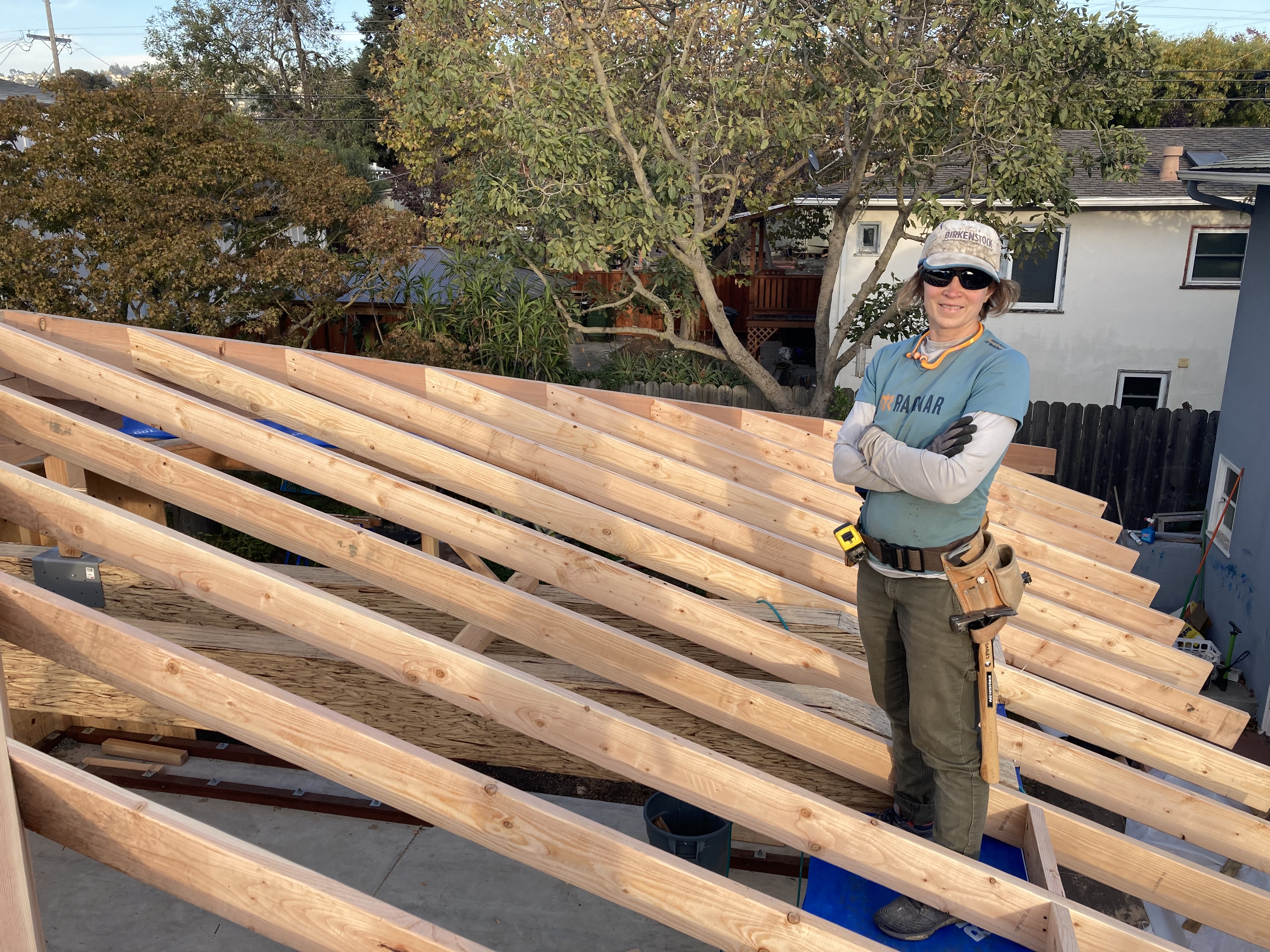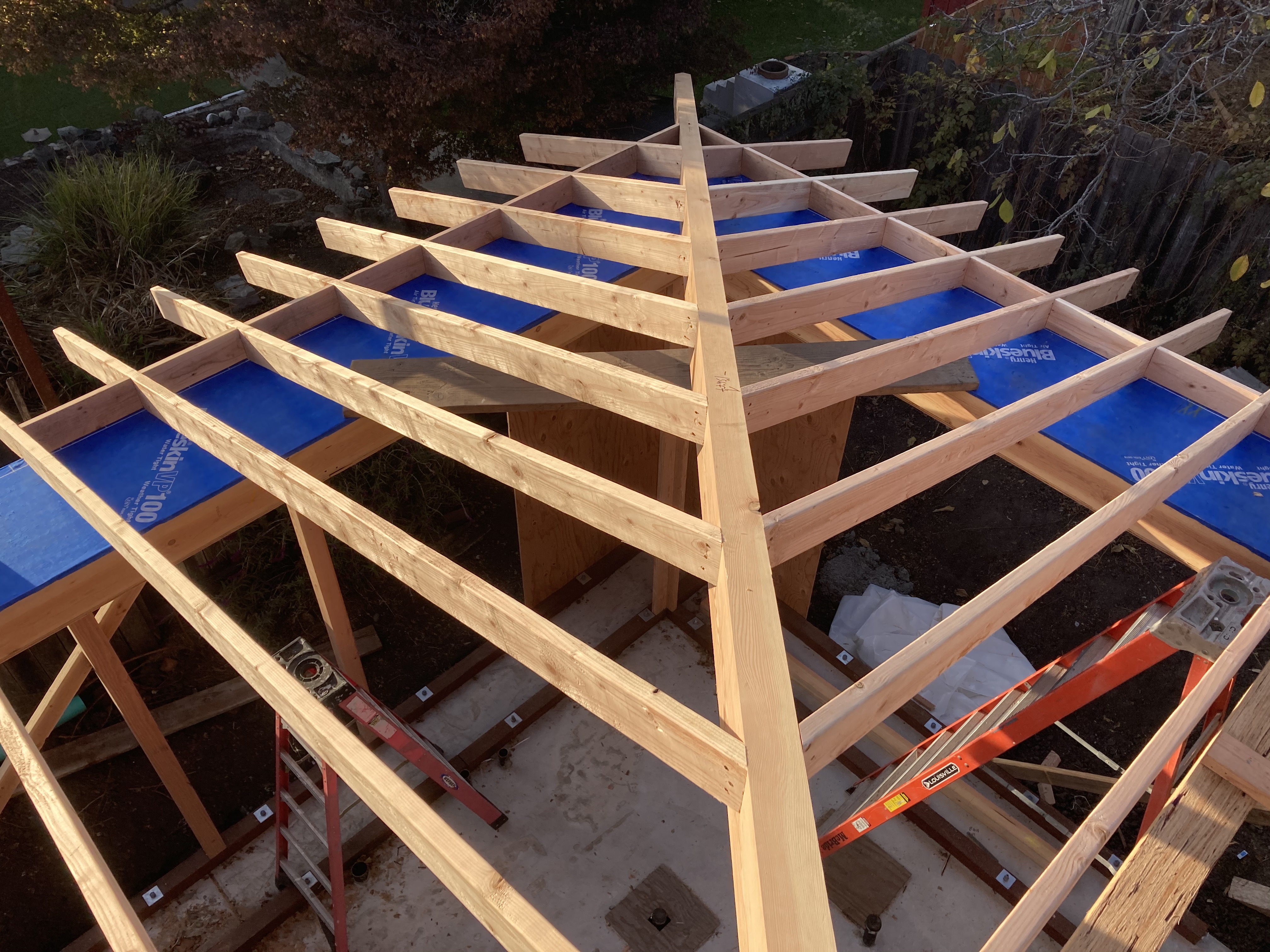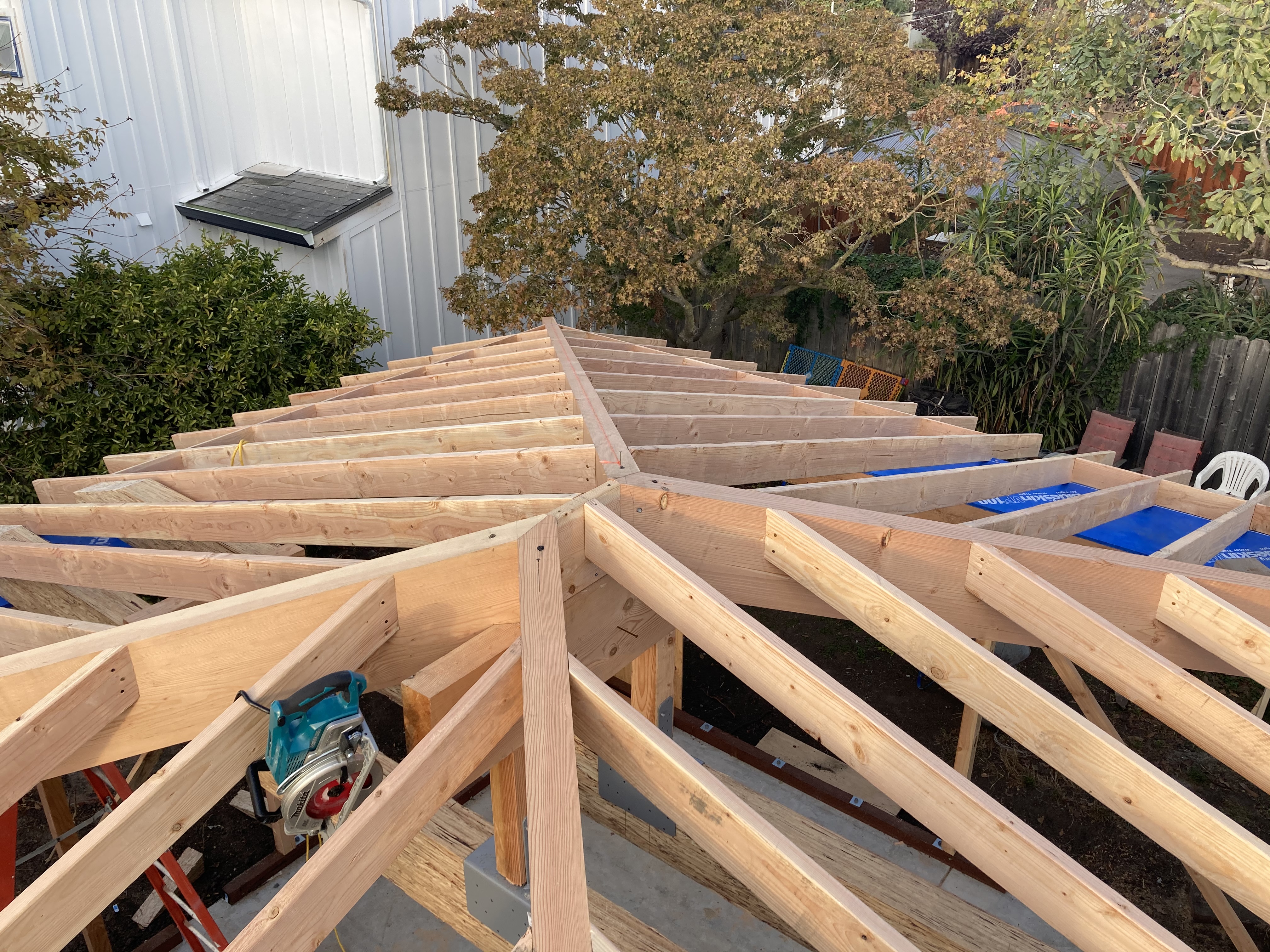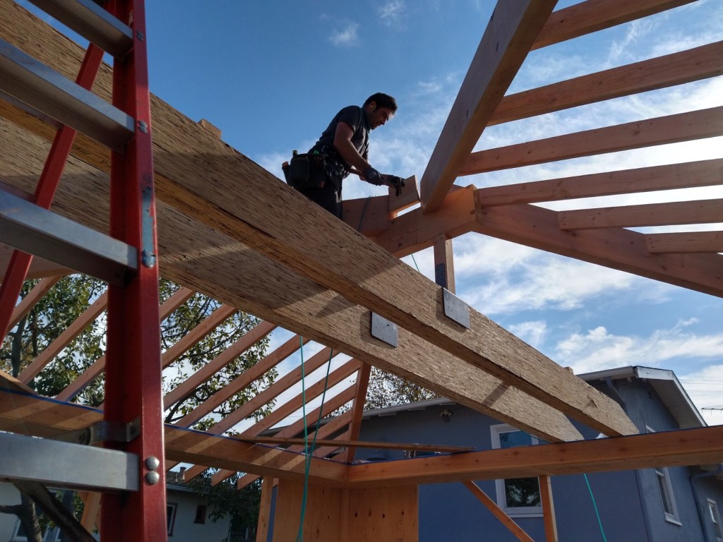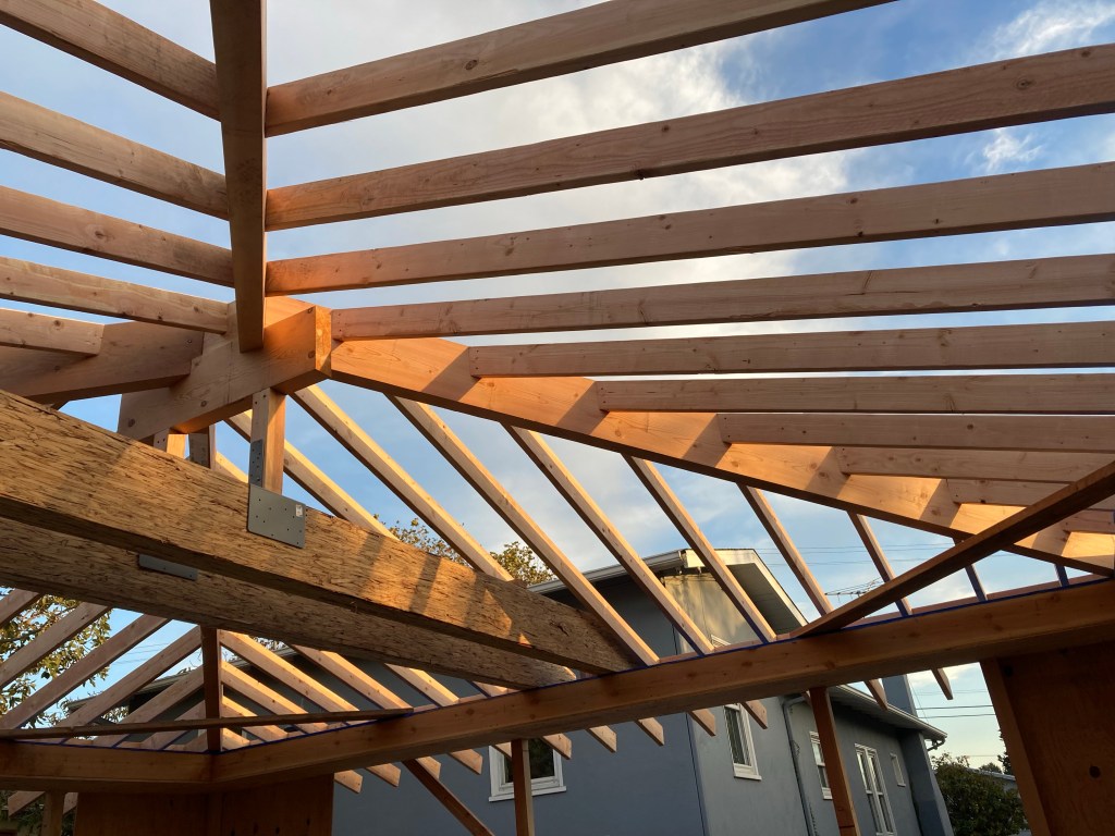 The owner took these photos for me of our little ADU taking shape. In the first photo you can see our 4×6 rafter tails with a curve. These will get gyp sheathing above with non flammable (Hardiboard & Boral) material on the outside. No venting. (Roof sheathing is kept above the dewpoint with rigid insulation on top.) The lower eaves that are less visible will be enclosed completely. The last photo is john rabbeting one of the exposed fir beams for the interior.